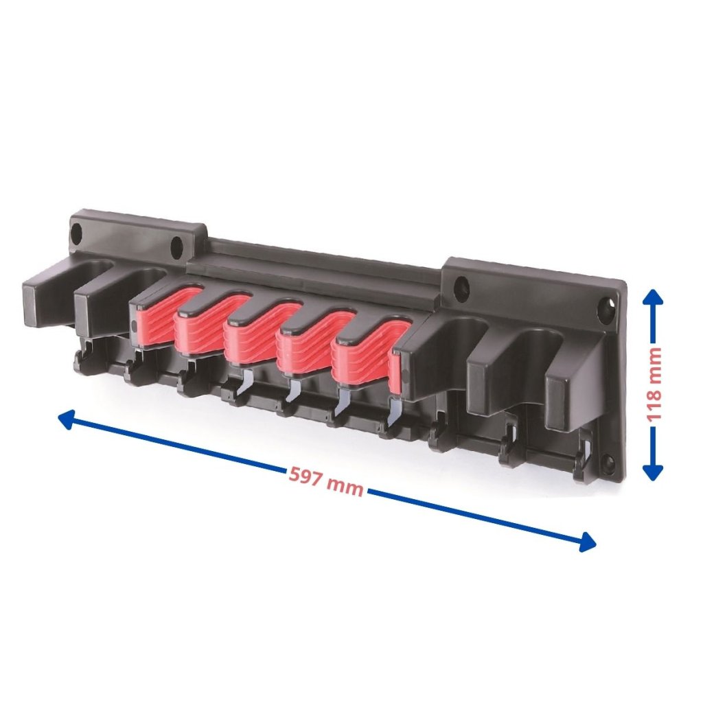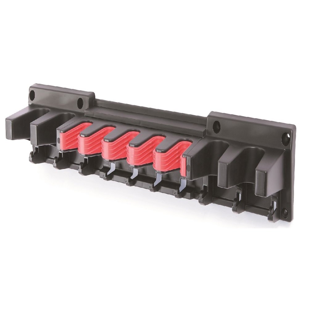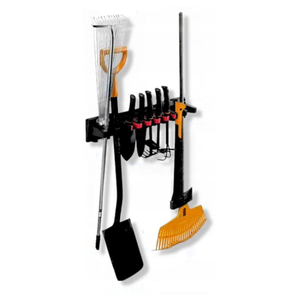 Modern fali akasztó (tartó) gumiborítással. Nem csak kerti szerszámok rögzítésére. Falra vagy táblára szerelhető.