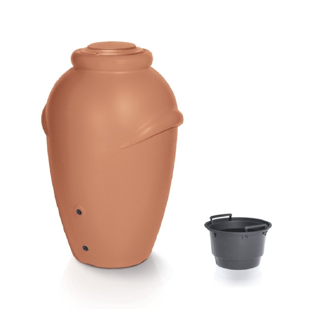 A tartály formáját és felépítését egy ókori amfora modellje ihlette, kiváló minőségű műanyagból (kőutánzat) készült, amely ellenáll az időjárás viszontagságainak. Két nyílással van ellátva a vízkivezetéshez (csap, tömlő - nem tartozék). A felső fedél csészealjként szolgálhat az edény alatt.