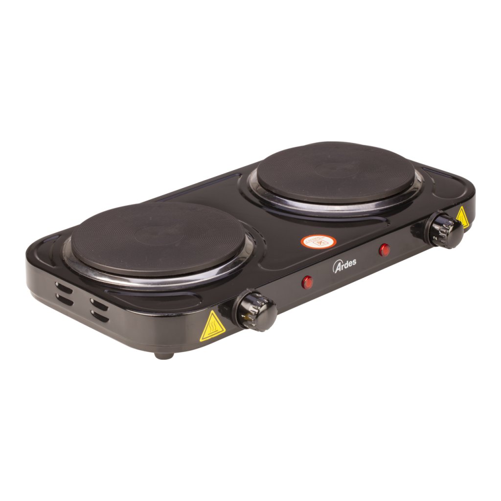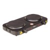 Két égős öntöttvas tűzhely 2 főzőlap 18,5 és 15,5 cm átmérőjű (1500W + 1000W) Fokozatmentesen állítható termosztát 2 visszajelző lámpa Kompakt méretek Túlmelegedés elleni védelem Csúszásmentes lábak Könnyen kezelhető Könnyű tisztítás Nagy teljesítményfelvétel biztosítja a gyors forró tányérokat Elegáns fekete design