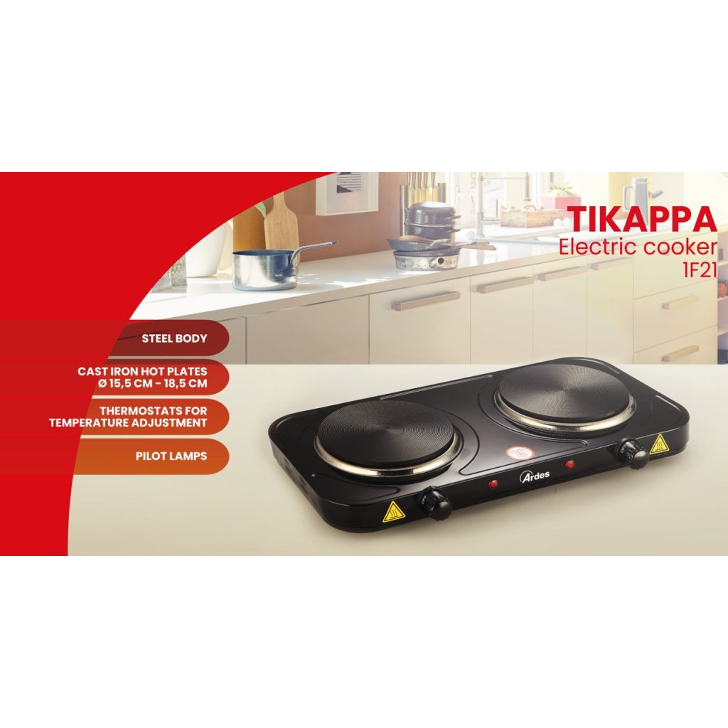 Két égős öntöttvas tűzhely 2 főzőlap 18,5 és 15,5 cm átmérőjű (1500W + 1000W) Fokozatmentesen állítható termosztát 2 visszajelző lámpa Kompakt méretek Túlmelegedés elleni védelem Csúszásmentes lábak Könnyen kezelhető Könnyű tisztítás Nagy teljesítményfelvétel biztosítja a gyors forró tányérokat Elegáns fekete design