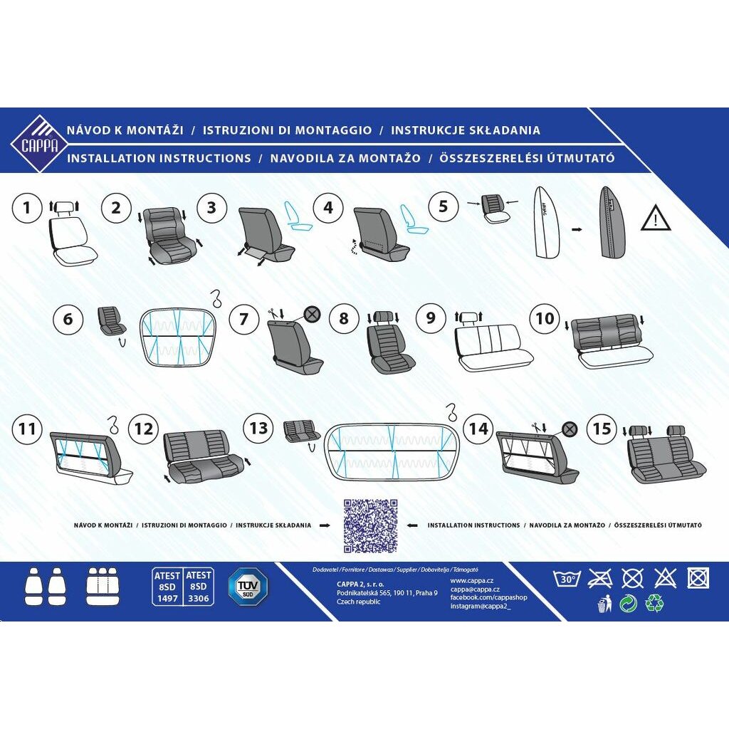 A FABIA hímzett üléspárnákat oldallégzsákkal ellátott járműüléseken való használatra gyártják és tanúsítják. A légzsákok kioldása esetén az autóülés párnájának oldalán lévő speciálisan varrt varrás elszakad. Használható a FABIA I, II, III modelleken. Az autósülés huzatok nem csúsznak az ülésen a huzat belső oldalán található puha habnak köszönhetően. A karfák és az ülésrészek poliészter szövetből készültek. A csövek és az autósülés háttámlája 100% poliészterből készült. Az első üléshuzatokon előre elkészített lyuk van a fejtámlák számára. A hátsó részeken a huzat gondos felszerelése és kikapcsolása után a fejtámlák helyére lyukat kell lyukasztani. Az utolsó lépésben a lyukakat műanyag gyűrűkkel rögzítjük az üléshez. A hátsó ülések 3 cipzárral vannak felszerelve az osztott ülések összecsukásához. Az autóüléshuzatok alkalmasak a nem osztott hátsó ülésekkel, valamint az 1 3 mindkét oldalon vagy 50 50 arányban osztott hátsó ülésekkel rendelkező járművekhez. Tulajdonságok: Oldallégzsákkal is rendelkező járműüléseken való használatra gyártott és tanúsított. az autóüléshuzatok nem csúsznak az ülésen a huzat belsejében található puha habnak köszönhetően az első üléseken előre elkészített lyuk van a fejtámlákhoz a hátsó háttámlák 3 cipzárral vannak ellátva a huzatok alkalmasak mind az osztott hátsó ülésekkel, mind az osztott hátsó ülésekkel rendelkező járművekhez, amelyek mindkét oldalán 1 3 vagy 50 50. Készlet 5 üléshez könnyű összeszerelés Műszaki leírás: Anyag: poliészter - hab mosógépben mosható 30 fokon használható a következő járműveken: FABIA I, II, III ATEST 8SD 1497: jóváhagyás a Cseh Köztársaságban a gépjárművek üléshuzataira. ATEST 8SD 2653: jóváhagyás az oldallégzsákkal felszerelt járművek üléshuzataira a Cseh Köztársaságban. ATEST 27MD 2038: jóváhagyás a gépjárművek üléshuzataira SK-ban. A csomag 11 részt tartalmaz: táblázat szegély 1 cellapárnázat 0trtd Vezetői ülés td td 1× háttámla td td 1× ülőrész td td 1× fejtámla huzat td trtrtd Utasülés td td 1× támaszrész td td 1× ülőrész td td 1× fejtámla huzat td trtrtd Hátsó ülések td td 1× ülőrész td td 1× 3 cipzárral összekötött tartó rész td td 3× fejtámla huzat td tr asztal