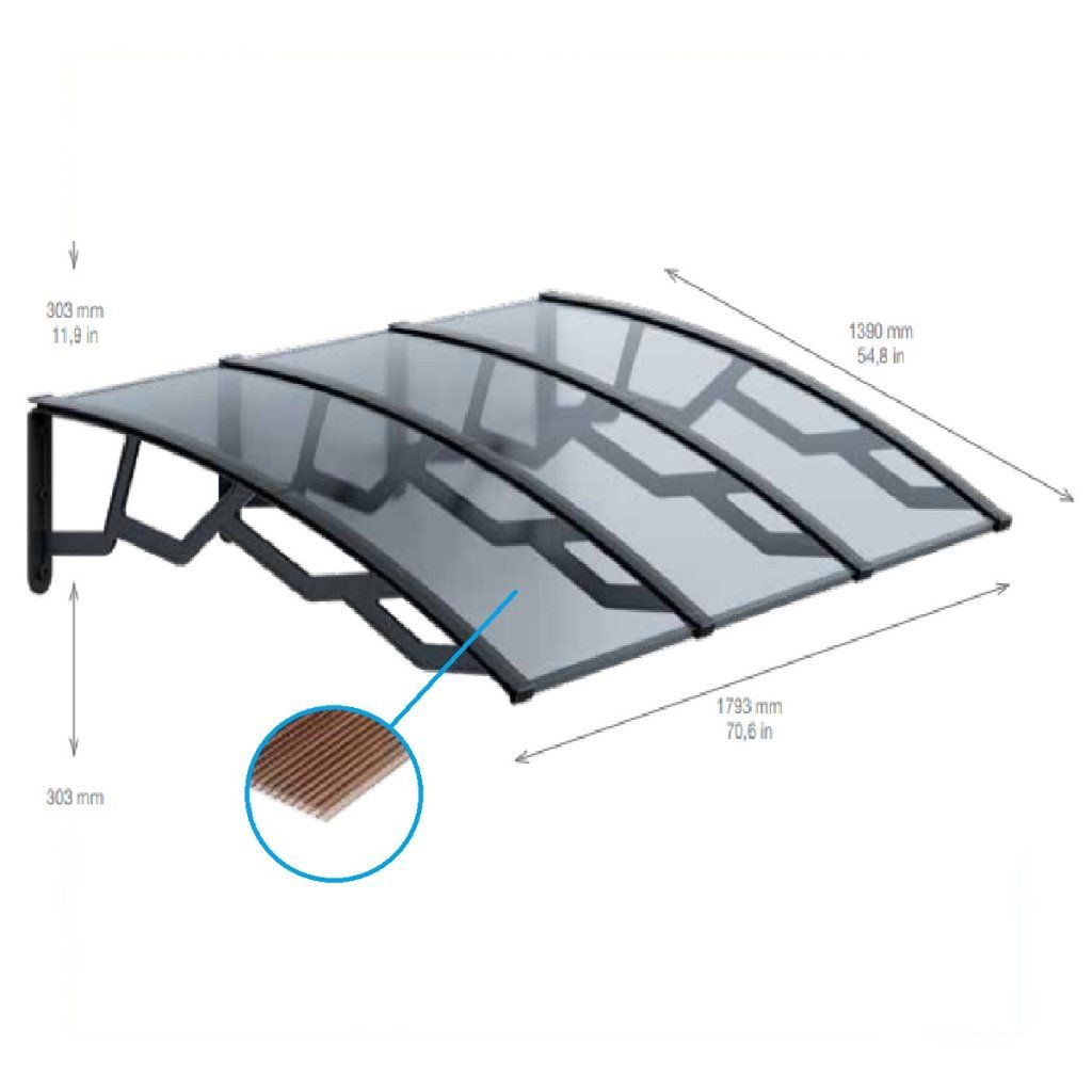 Kamrás, füstszínű polikarbonátból készült, 6 mm vastagságú, UV-védelemmel ellátott tető. Tartókarok/keret megerősített polipropilénből, sötétszürke színben. Az előtető védelmet nyújt a kedvezőtlen időjárás ellen és védi a bejárati területet. Az épület körüli erkélyek vagy járdák részleges lefedéseként is használható.