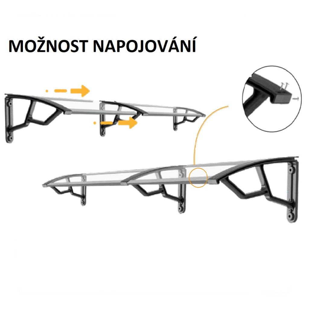 Kamrás, füstszínű polikarbonátból készült, 6 mm vastagságú, UV-védelemmel ellátott tető. Tartókarok/keret megerősített polipropilénből, sötétszürke színben. Az előtető védelmet nyújt a kedvezőtlen időjárás ellen és védi a bejárati területet. Az épület körüli erkélyek vagy járdák részleges lefedéseként is használható.