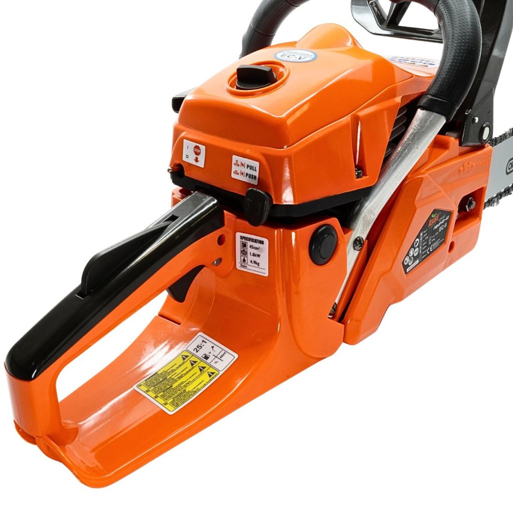 A benzines láncfűrész WALBRO karburátorral és OREGON rúddal és lánccal, 45 cm3 hengerűrtartalommal és 40 cm rúdhosszal mindazok segítője, akik otthon vagy hobbi szinten fával dolgoznak. A fűrész automatikus láncolajozással és biztonsági funkciókkal van felszerelve. A fűrész használható fák kivágására, fák metszésére és rönkök, farönkök és fatermékek vágására. A fűrész otthoni és hobbi célra is használható.