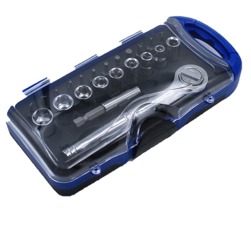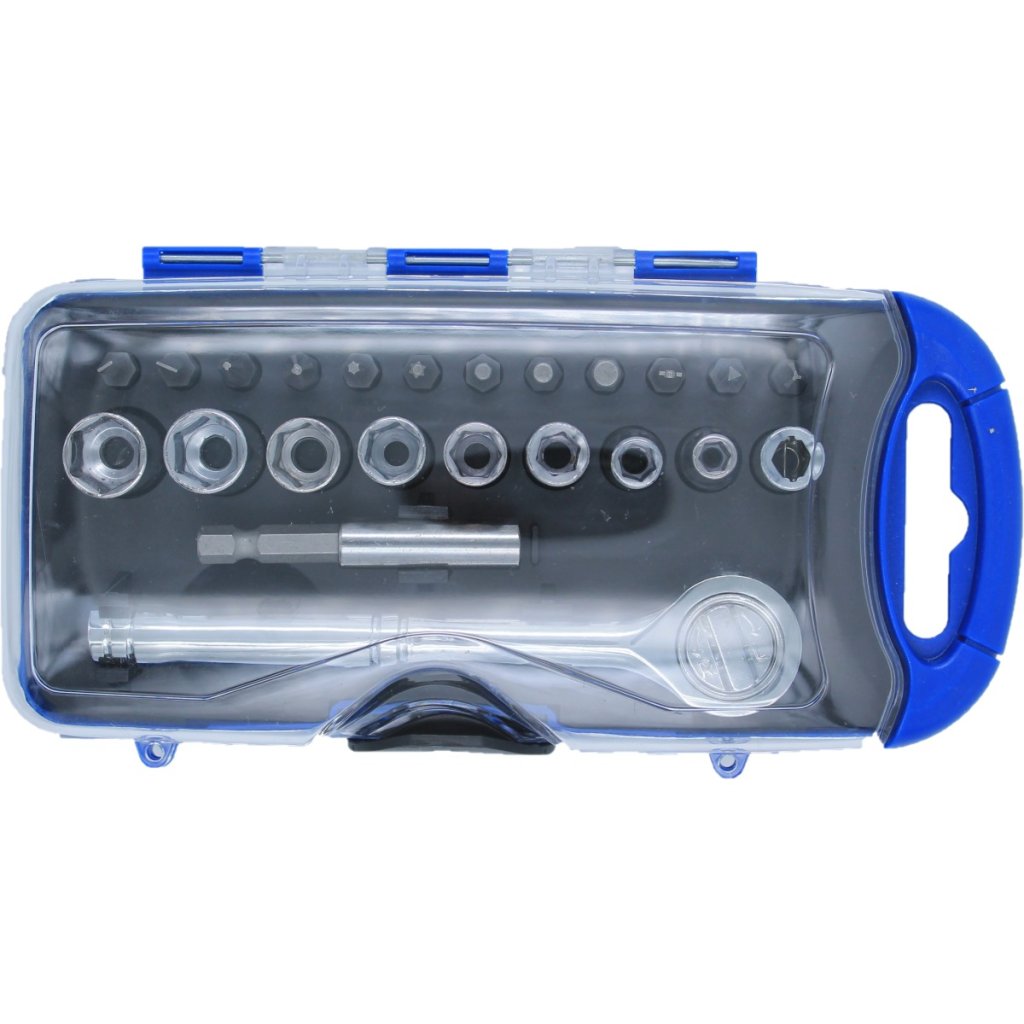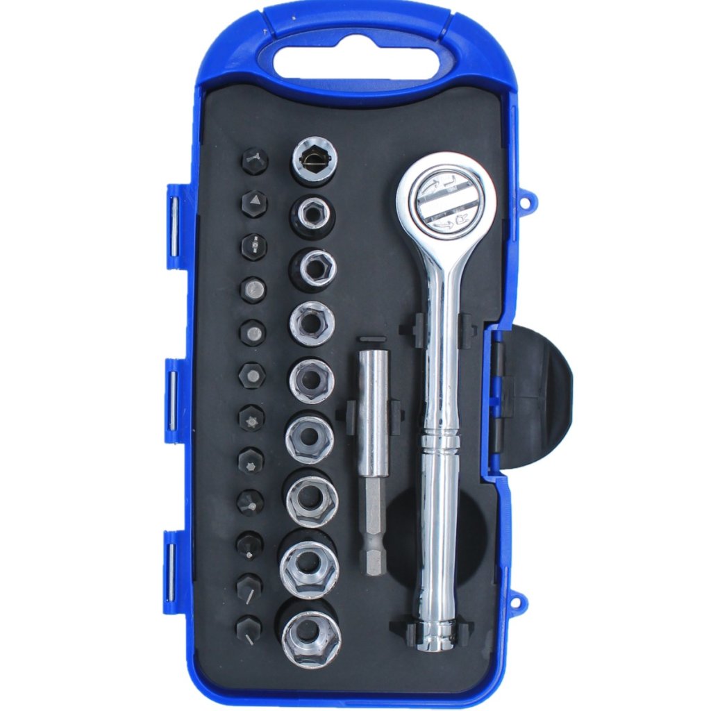 1x racsni 1/4, mágneses hosszabbító, 8x foglalat 5-12mm + adapter, 12x bit króm-vanádium, praktikus dobozban