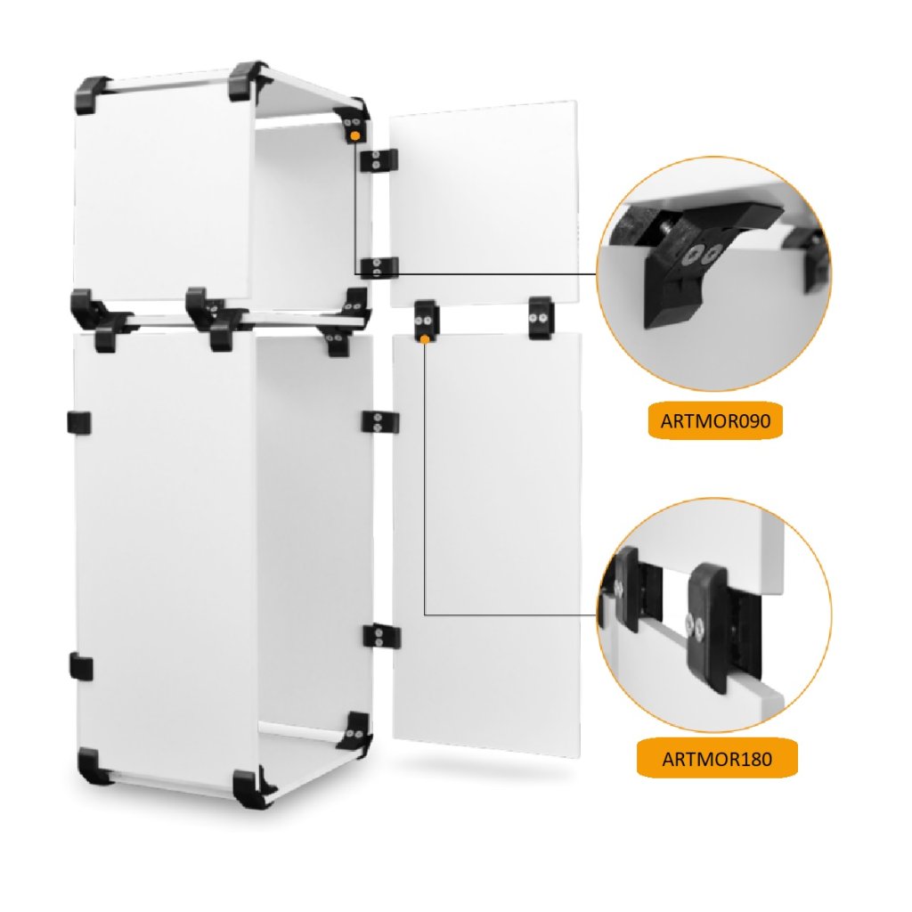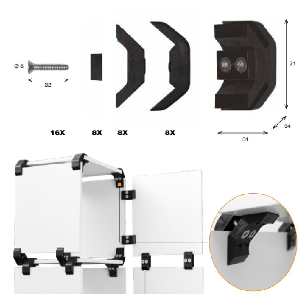 Készlet fa, üveg vagy akril panelek összekapcsolására, egyszerű és gyors összeszerelés, a polcok függőlegesen vagy vízszintesen is összeszerelhetők, ha úgy döntesz, bármikor megváltoztathatod az összeszerelést, modern design, a hálószobától a műhelyig bárhová illik a lakásban, a szín- és formavar...