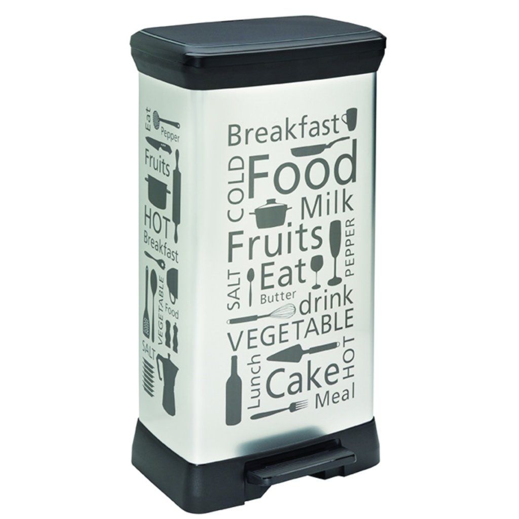 Modern műanyag hulladékgyűjtő DECOBIN konyhai motívummal, kényelmes nyitás pedál segítségével, alkalmas konyhába, fürdőszobába vagy irodába, nincs ujjlenyomat a felületen, nedves helyiségekbe is alkalmas, ütés- és deformációálló, térfogata 50L, 73 x 39 x 29 cm.