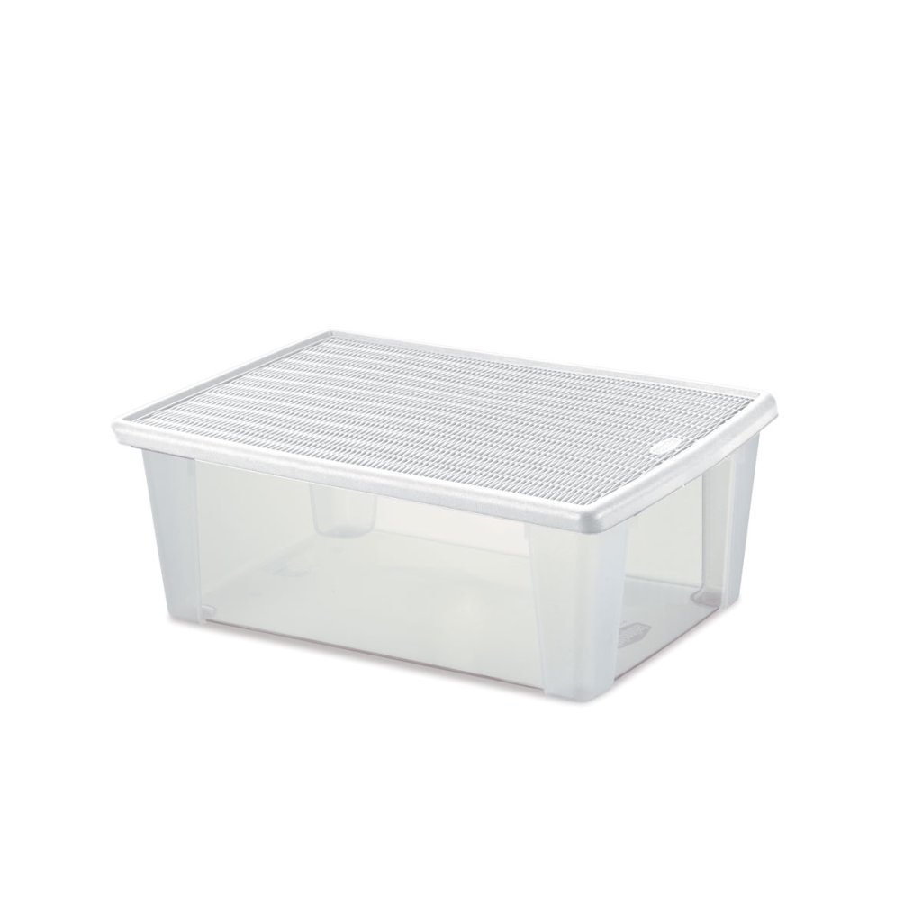Multifunkciós műanyag doboz, méretei 39 × 29 × 17 cm, elegáns textúra, zárható fedél, ideális tárolásra és szervezésre.