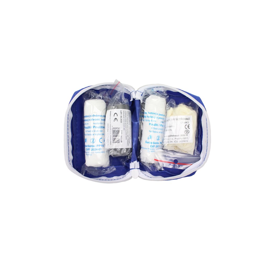 Egyszerű elsősegélycsomag rugalmas tokban, jellegzetes kék színben. L kategóriájú gépjárművekhez (motorkerékpárok) tervezték. Az elsősegélycsomag megfelel a 206/2018 sz. rendelet 12. mellékletének. AZ ELSŐSEGÉLYCSOMAG TARTALMA: 1 darab kész kötszer 1 betéttel 1 darab kész kötszer 2 betéttel 1 db gumi fojtókötés (60 x 1250 mm) 1 pár latex kesztyű, sebészeti Műanyag csomagolású, cipzárral záródó cortexin tasakban szállítva.