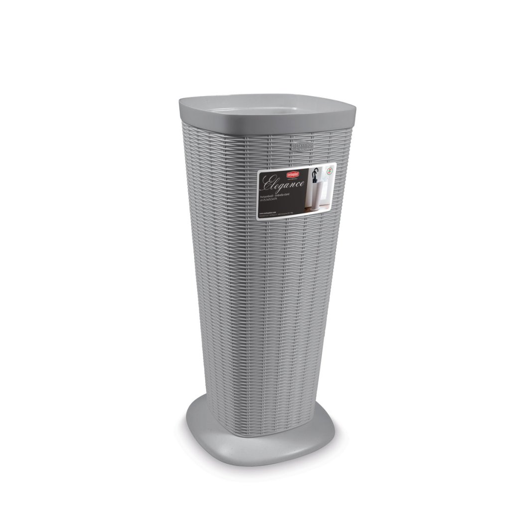 Az Elegance esernyőtartó praktikus és dizájnos kiegészítője az előszobának, folyosónak vagy irodának. A szövetre emlékeztető finom textúrájú műanyag szerkezetének köszönhetően modern és elegáns megjelenésű. Könnyű, de stabil formája biztosítja, hogy egyszerre több esernyő is biztonságosan tárolható legyen. Az állvány alján vízelvezető lyukak találhatók, amelyek segítenek szárazon tartani a környező padlót.