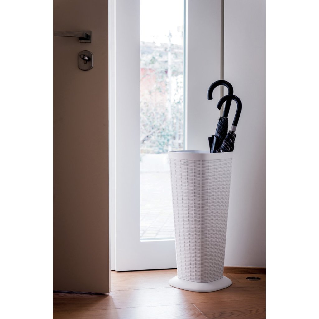 Az Elegance esernyőtartó praktikus és dizájnos kiegészítője az előszobának, folyosónak vagy irodának. A szövetre emlékeztető finom textúrájú műanyag szerkezetének köszönhetően modern és elegáns megjelenésű. Könnyű, de stabil formája biztosítja, hogy egyszerre több esernyő is biztonságosan tárolható legyen. Az állvány alján vízelvezető lyukak találhatók, amelyek segítenek szárazon tartani a környező padlót.
