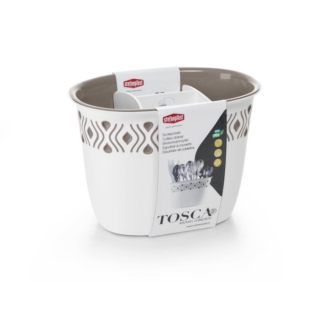 A Stefanplast Tosca evőeszköz-leeresztő edény egy praktikus evőeszköz-leeresztő edény, amelyet a mindennapi konyhai használatra terveztek. Négy különálló rekesszel rendelkezik, amelyek lehetővé teszik a kések, villák, kanalak és egyéb konyhai eszközök rendezett szortírozását. Kiváló minőségű műanyagból készült, amely könnyű, erős és könnyen mosható. A visszafogott dizájnnal rendelkező elegáns megjelenés bármely konyhai enteriőrbe illik, és tökéletesen illeszkedik a Tosca termékcsalád többi termékéhez.