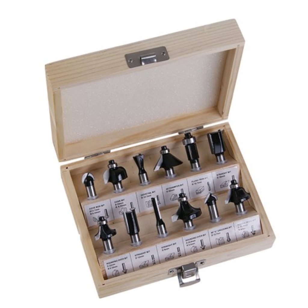 Fa formavágók - 12 db-os készlet, a vágók minőségi SK szeletekkel vannak felszerelve, különböző típusú formavágók vezető kerék nélkül vagy vezető kerékkel és minőségi csapágyazással, felhasználás : különböző formájú hornyok és élek marásához, szár 8mm, csomagolás : fadoboz.
