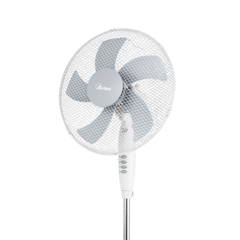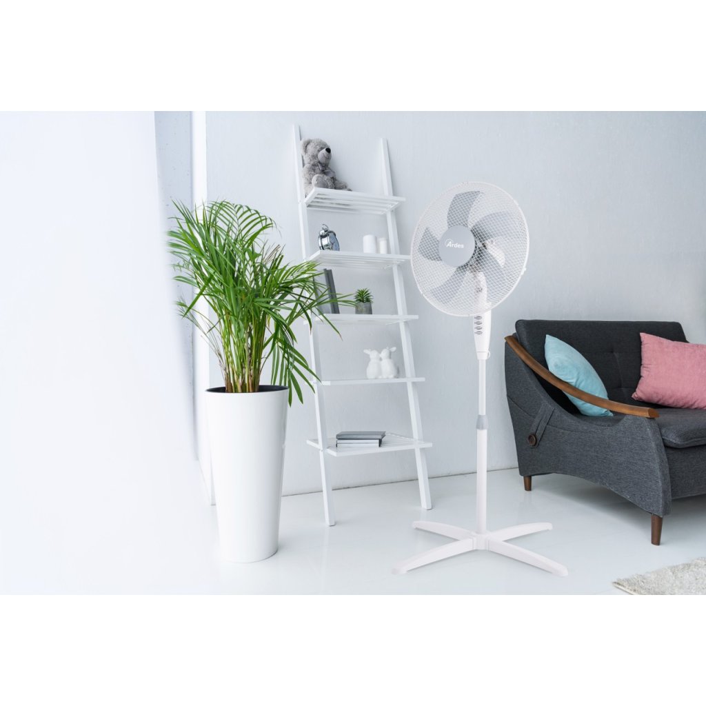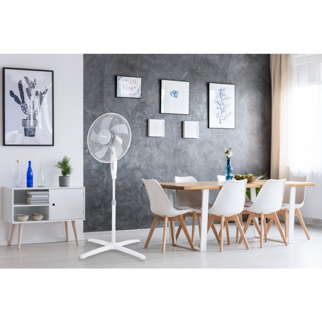 A légcsavar átmérője 40 cm 5 nagysebességű légcsavar védőrács felvett teljesítmény 50 W 3 sebességfokozat állítható magasság 102 - 120 cm automatikus oszcilláció fehér-szürke design
