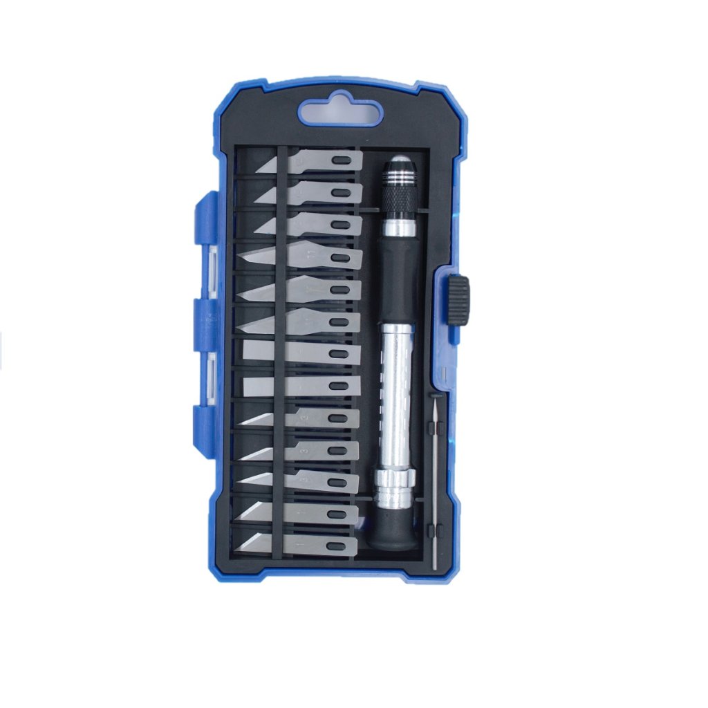 A praktikus, biztonsági csattal záródó műanyag dobozban 15 tartozékot talál. Válassza ki a kívánt hegyű kést, és pillanatok alatt rögzítse a nyélhez, így azonnal munkához láthat.