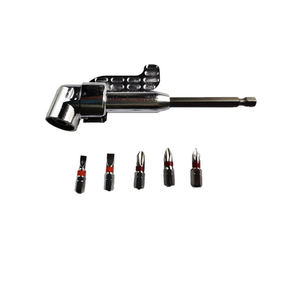 A sarokrögzítő könnyen csatlakoztatható fúrógéphez vagy akkumulátoros csavarhúzóhoz. Fogja meg a sarokrögzítőt, és szorítsa be a hatszöget a fúrógép tokmányába. Ezután helyezze be a kívánt bitet a munkához. Munka közben tartsa a rögzítőt a kezével.