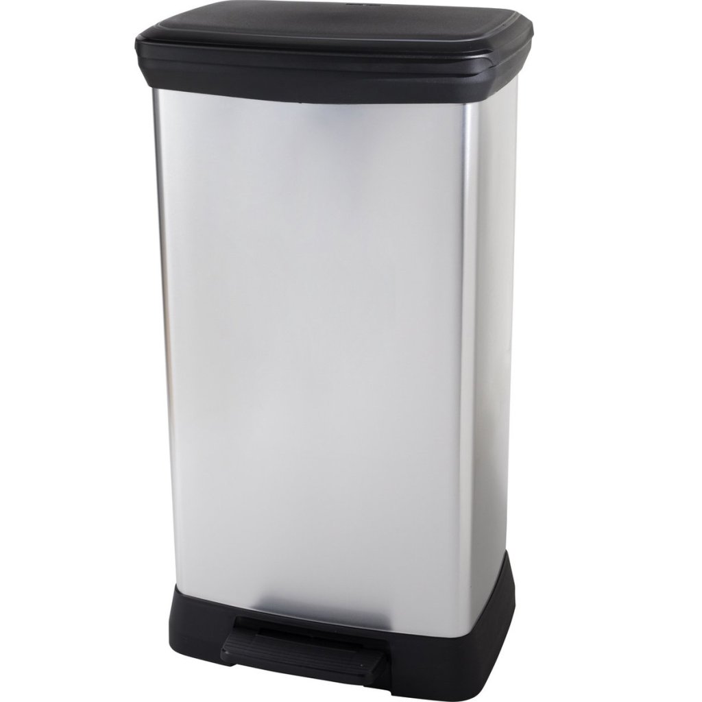 Modern DECOBIN műanyag dupla szemetes kosár ezüst színben, kényelmes nyitás pedállal, alkalmas konyhába, fürdőszobába vagy irodába, nem hagy ujjlenyomatot a felületen, nedves helyiségekbe is alkalmas, ütés- és deformációálló, térfogata 2 x 23L.