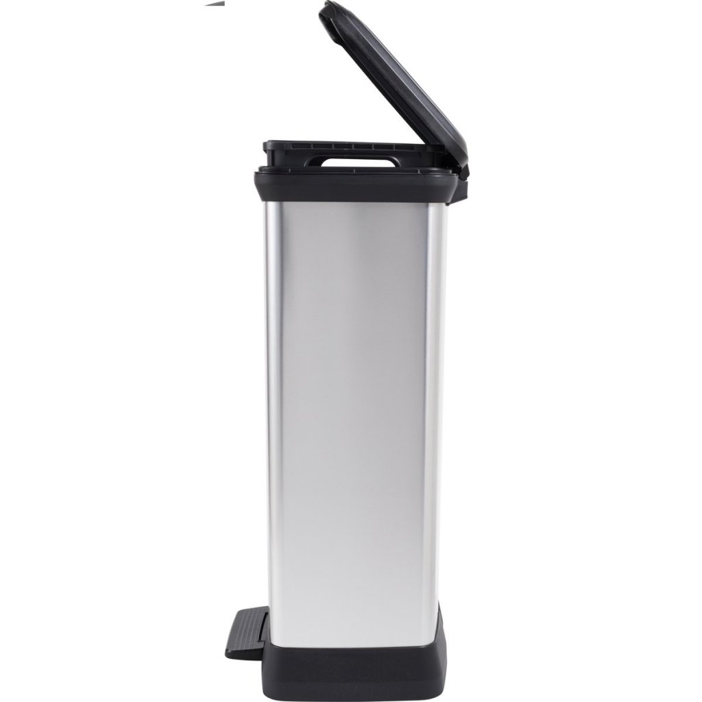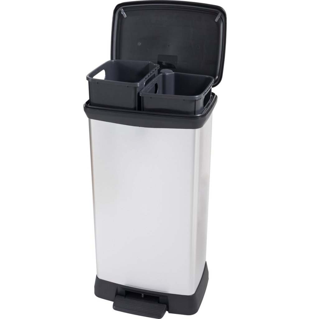 Modern DECOBIN műanyag dupla szemetes kosár ezüst színben, kényelmes nyitás pedállal, alkalmas konyhába, fürdőszobába vagy irodába, nem hagy ujjlenyomatot a felületen, nedves helyiségekbe is alkalmas, ütés- és deformációálló, térfogata 2 x 23L.