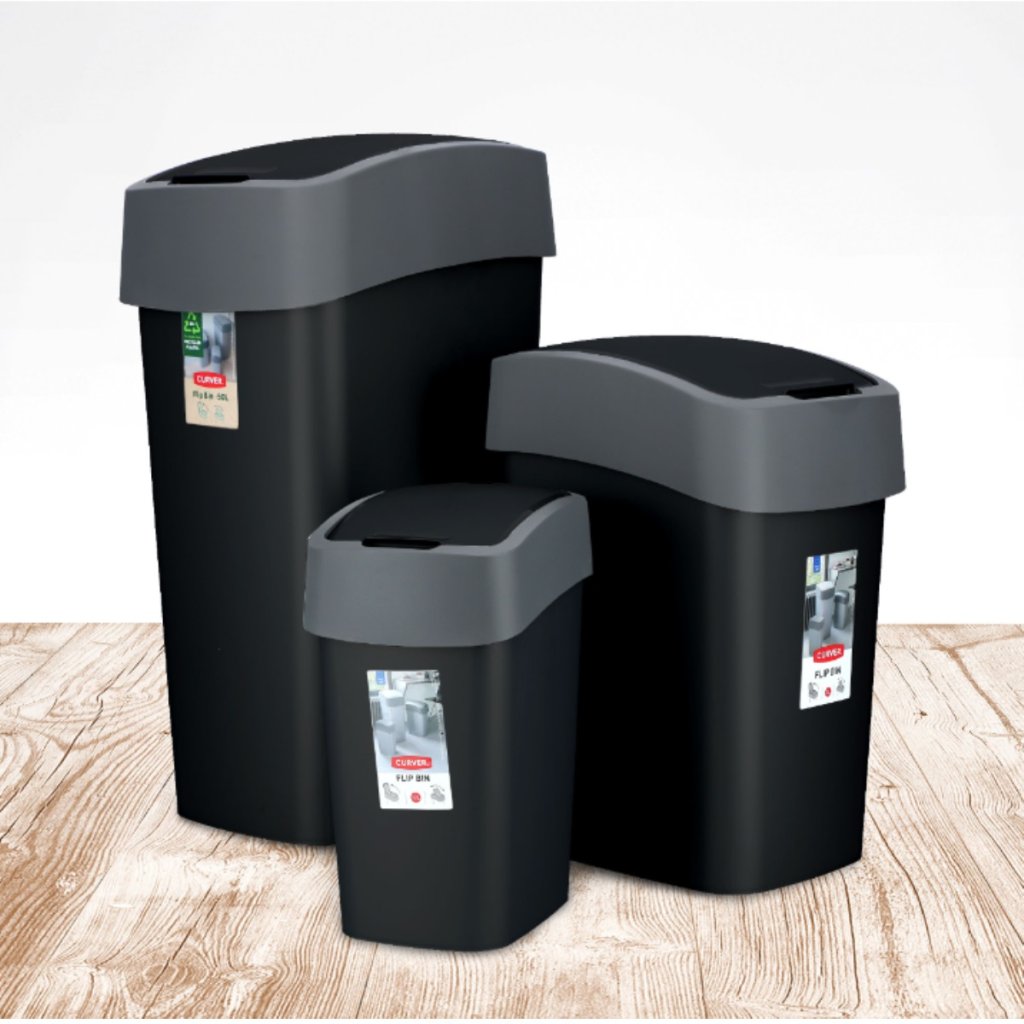 Fekete színű FLIP BIN műanyag hulladékgyűjtő, forgatható, automatikusan záródó fedéllel, 45 l űrtartalommal, 29,5 x 37,5 x 65 cm.