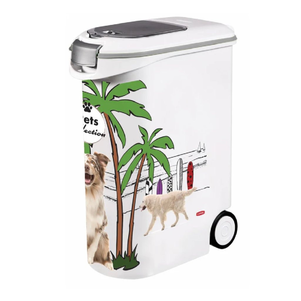 A műanyag tartály száraz kutyaeledel (20 kg) tárolására szolgál. A hátoldalon található kerekek megkönnyítik a konténer szállítását. A Konténer tömítéssel van ellátva, amely megakadályozza a levegő keringését és a szagok kiszivárgását, így az eledel frissen marad, megőrizve az összes vitamint. A konténer praktikus nyílással rendelkezik, ahol a pelletek könnyebb kiszedése érdekében egy kanál is helyet kapott.