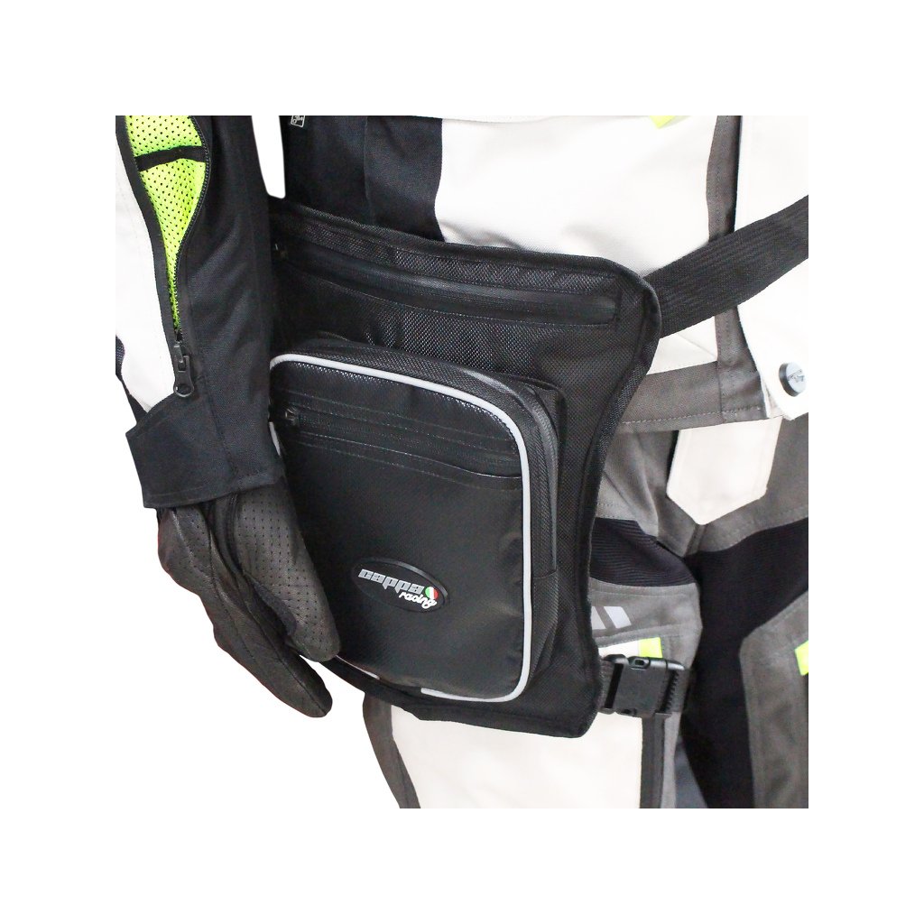 Egyszerű SUZUKA láb- vagy csípőtáska, amelyet elsősorban motorosok számára terveztek. Alkalmas dokumentumok, kisebb tárgyak vagy értéktárgyak tárolására, amelyeket a motorkerékpárról való leszálláskor magával szeretne tartani. Műanyag csatokkal és fényvisszaverő csíkkal ellátott, állítható pántokkal felszerelt. A táska 3 cipzáras zsebből áll. A cipzárakon és a táska elején található PVC bevonat biztosítja a magas vízállóságot. A táska kialakítása szinte bármilyen stílusú felszereléshez illik. Ugyanakkor a táska lapossága nem korlátozza a kezelhetőséget. R MÉRETEK: Szélesség: 25 cm Magasság: 29 cm Mélység: 6 cm MŰSZAKI LEÍRÁS: Poliészter 600D, PVC Űrtartalom: 2 l Súly: 220 g Fényvisszaverő elemek Állítható pántok műanyag csatokkal 3 cipzáras zseb