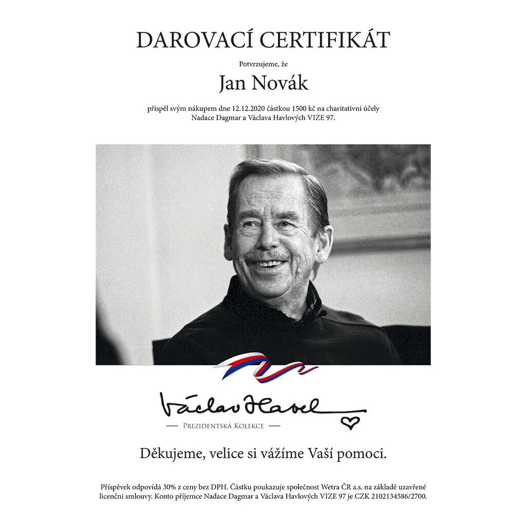 *) A vásárlás ÁFA nélküli értékének 30%-át automatikusan a Vision 97 jótékonysági szervezetnek, a Dagmar és Václava Havelých Alapítványnak ú ú adományozzuk.