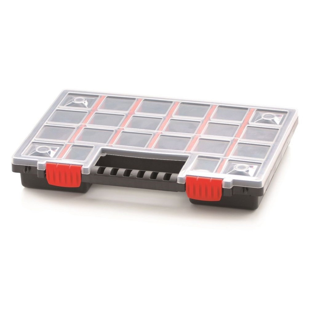 Hordozható szervező csavarok, anyák, alátétek és hasonló apróságok számára. Egymástól elválasztott rekeszekkel rendelkezik. Narancssárga színű kapcsokkal rendelkezik a könnyű és biztonságos lezáráshoz. A műanyag fogantyúval könnyen hordozható. A szervező méretei 34,4 x 24,9 x 5 centiméter.