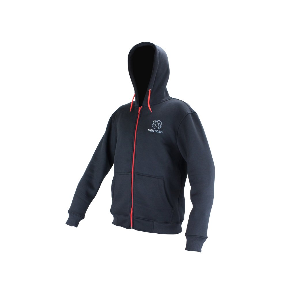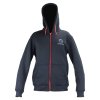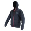 Munkahelyi pulóver pamutból és poliészterből, elasztikus derék és ujjvég, kapucni húzózsinórral, kenguru zseb, folyamatos cipzár, piros/fekete.