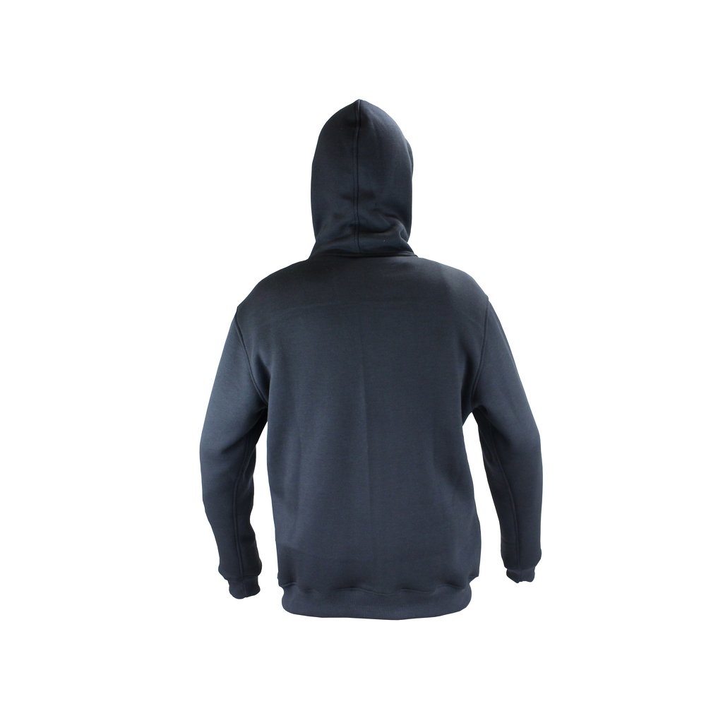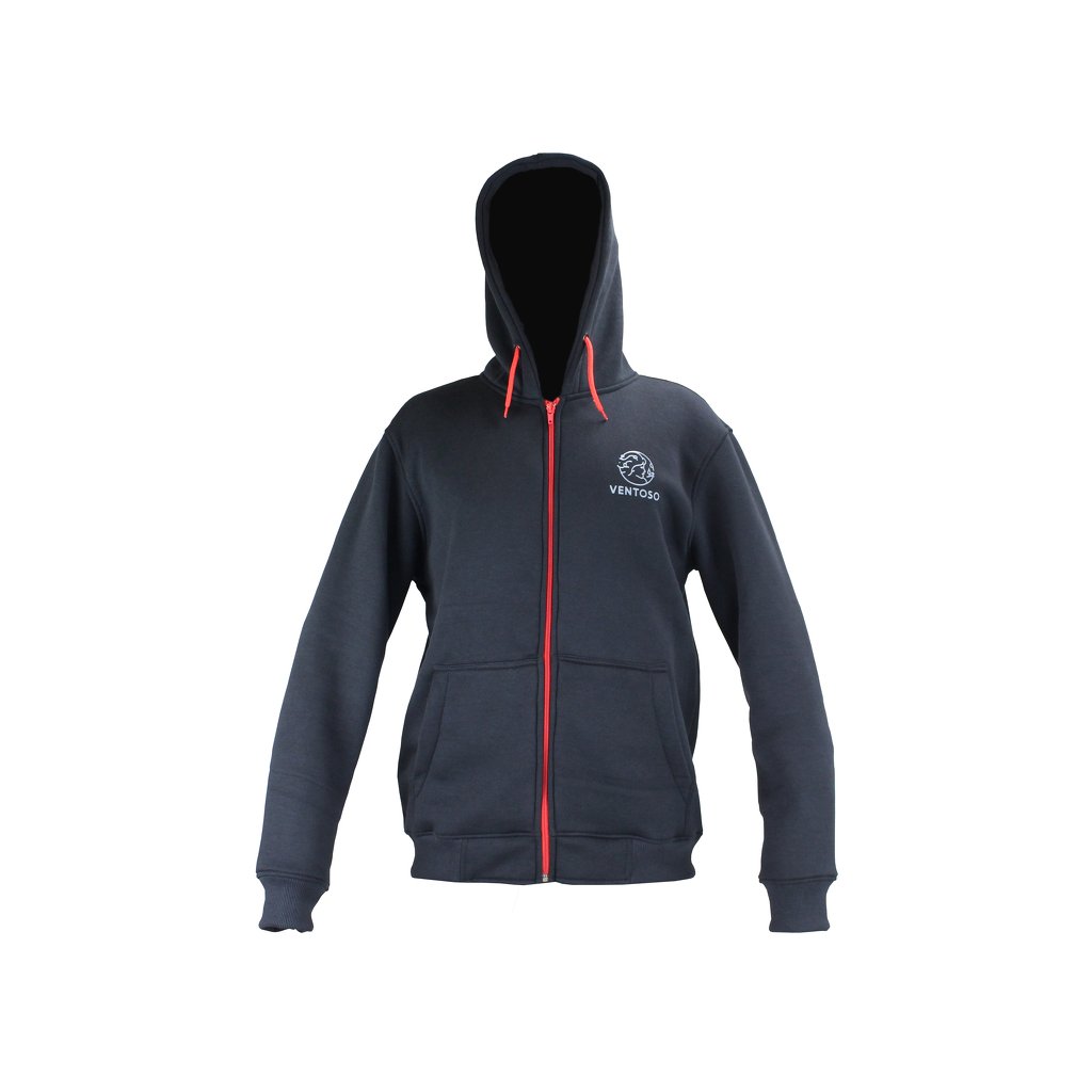 Munkahelyi pulóver pamutból és poliészterből, elasztikus derék és ujjvég, kapucni húzózsinórral, kenguru zseb, folyamatos cipzár, piros/fekete.