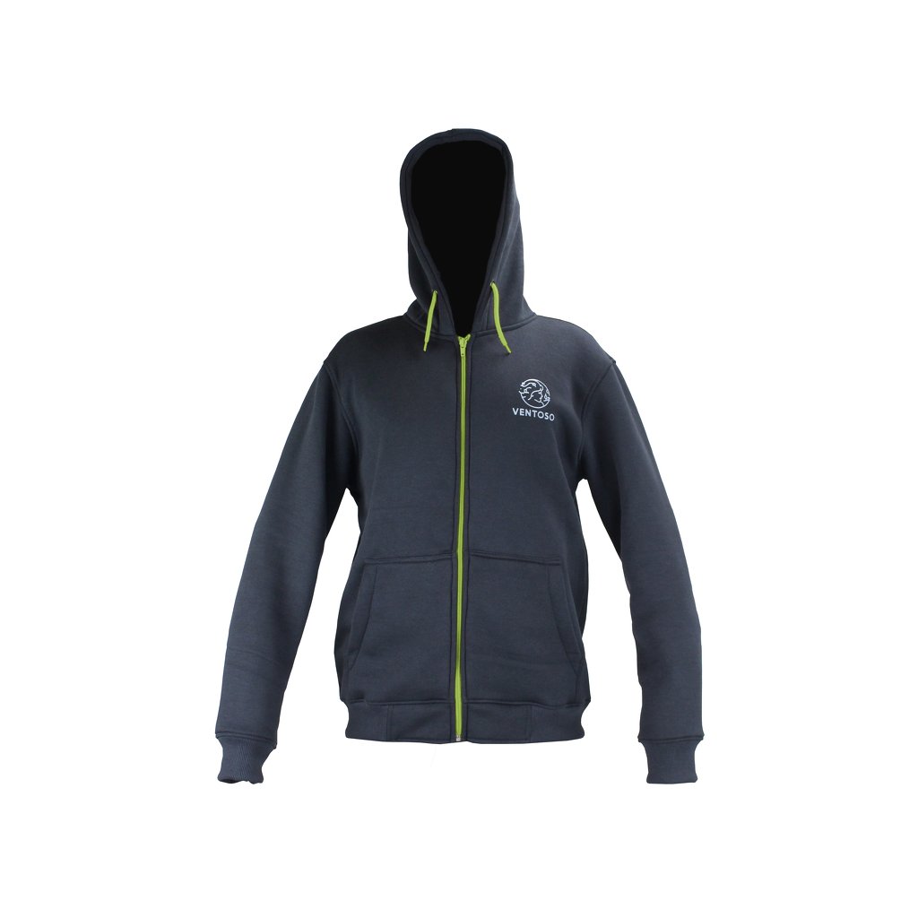 Pamutból és poliészterből készült munkapulóver, elasztikus derék és ujjvégek, húzózsinórral ellátott kapucni, kenguru zseb, folyamatos cipzár, zöld/fekete színben.