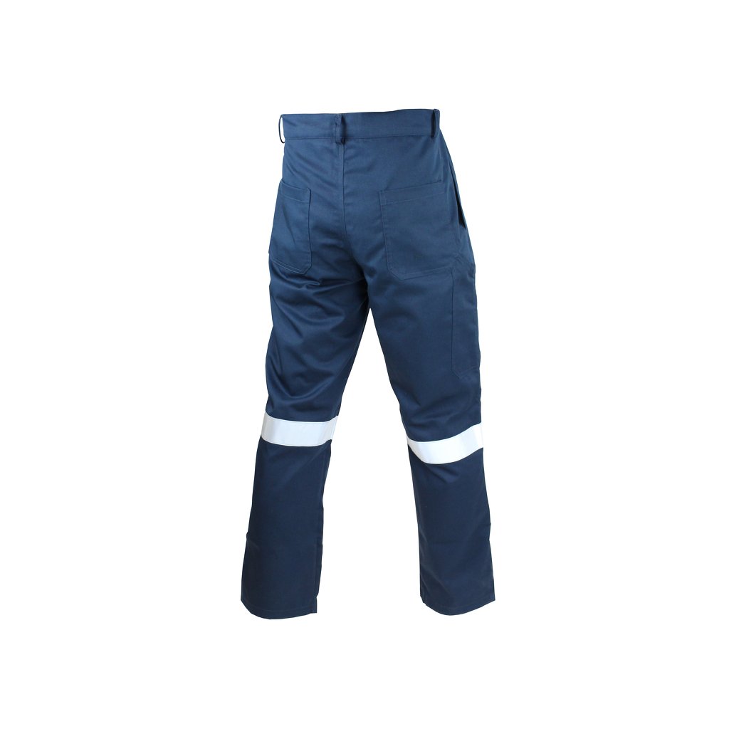 Klasszikus kék derekú nadrág, gombos rögzítéssel, fényvisszaverő csíkokkal, laza szabással a kényelem és a mozgásszabadság érdekében, gyűrődésmentes és gyorsan száradó.