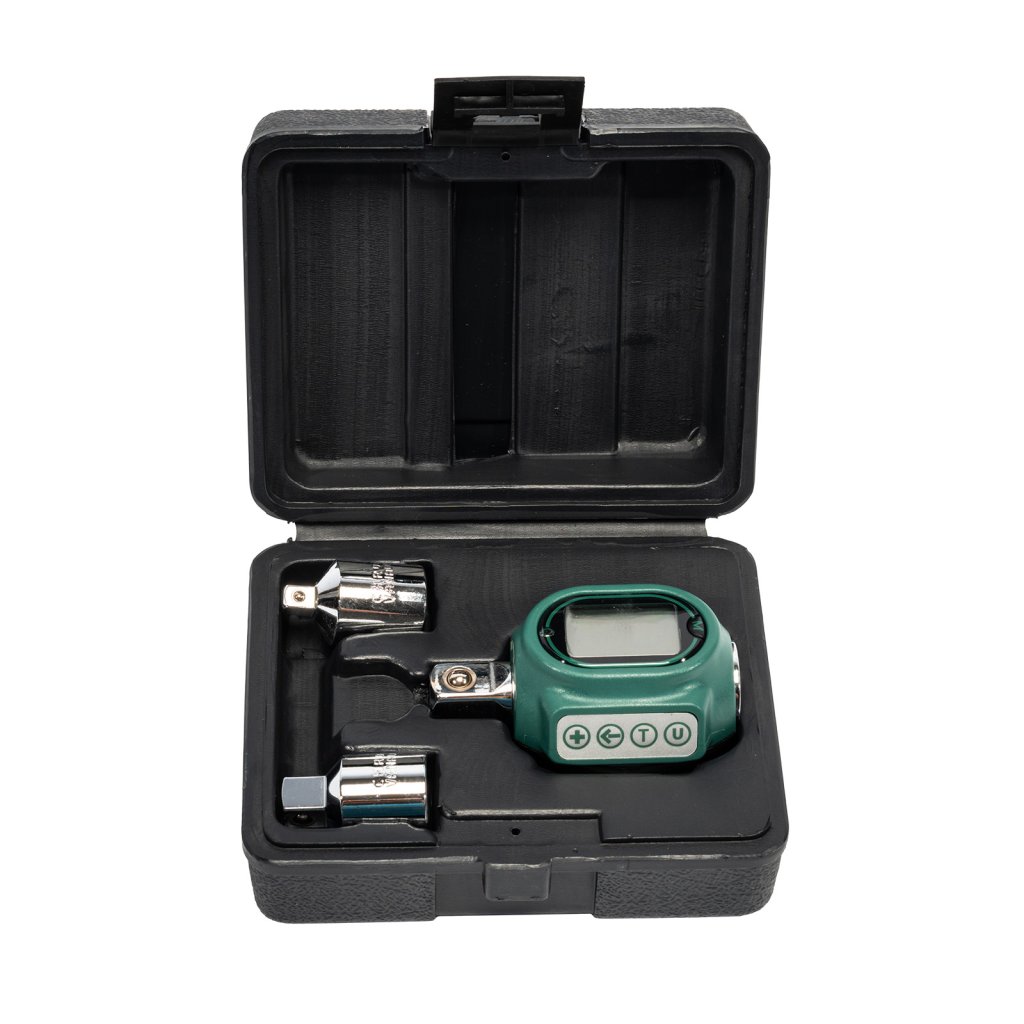 Digitális nyomatékadapter a racsnin a pontos nyomatékbeállításhoz. Hangjelzés és LED-kijelző figyelmeztet a beállított nyomaték elérésekor. Egyidejűleg a kívánt nyomaték %-ban történő kijelzése. Forgószerkezet a kijelző könnyű leolvasásához. Akkumulátor töltöttségi szintjelző.