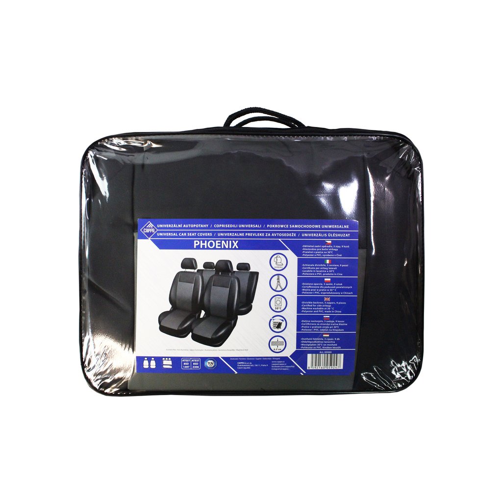 A PH ENIX üléspárnákat oldallégzsákkal ellátott járműüléseken való használatra gyártják és tanúsítják. A huzat oldalán egy speciálisan varrt lyuk található a légzsákok működésbe lépése esetére. Az autós üléshuzatok nem csúsznak az ülésen a huzat belső oldalán található puha habnak köszönhetően. A középső rész és a csövek ökobőrből készültek. Az oldalak és a hátlap rugalmas poliészterből készült. Az első üléshuzatokon előre elkészített lyuk van a fejtámlákhoz. A hátsó részeken a háttámlán lévő lyukat a huzat gondos felszerelése és eltávolítása után kell kilyukasztani. A hátsó ülések cipzárral vannak ellátva az osztott ülések összecsukásához. Az autóüléshuzatok 1 3 osztott hátsó ülésekkel és 50 50 osztott hátsó ülésekkel rendelkező járművekhez egyaránt alkalmasak. ANYAG: Öko bőr Elasztikus poliészter 0,5 cm-es PUR hab MŰSZAKI LEÍRÁS: Gyártva és tanúsítva a járműüléseken és oldallégzsákokon való használatra. Előre előkészített nyílás fejtámlákhoz és oldallégzsákhoz az első üléseken Az autóüléshuzatok nem csúsznak az ülésen a huzat belső oldalán található puha habnak köszönhetően A hátsó ülések cipzárral vannak ellátva Az üléshuzatok alkalmasak az osztott hátsó ülésekkel rendelkező járművekhez mindkét oldalon 1 3, illetve 50 50 Készlet 5 üléshez Könnyű összeszerelés Gépben mosható 30 A csomag 9 darabot tartalmaz: 0trtd Vezetői ülés td td 1× háttámla és ülésrész td td td td 1× fejtámla burkolat td trtrtd Utasülés td td 1× háttámla és ülőrész td td td td 1× fejtámla burkolat td trtrtd Hátsó ülések td td 1× ülőrész td td 1× 3 cipzárral összekötött tartó rész td td 3× fejtámla huzat td tr asztal UNI univerzális autóüléshuzatokat lehet használni a járműveken : Alfa Romeo: 33, 90, 145, 146, 155, 156, 164, Alfasud, AfettabrAudi: 50, 80, 90, A1 2010-, A1 Sportback, A3 -2012, A4, A6, A8 -2009, Q5, Q8brBMW: E30, E36, E46, E53, E70, E90, E93, E83, E84, F15, F25, F48brCitroen: CX, C3, C4, C4 Cactus, C5, C8, GSA, LN, Visa, Xantia, Xsara, ZXbrChevrolet Deawoo: Dacia: Duster -2023, Sandero I,II,III, Sandero Stepway I,II,III, Spring, LoganbrDaihatsu: Applause, Charade, Charmant, Cuore, Move, Travis, WildcatbrDodge: Fiat: 127, 128, 500 2007-, 500C, Bravo, Brava, Cinquecento, Marea, Panda 750, Panda 1000, Panda 2003-2012, Stilo, TipobrFord: Escort, Fiesta, Focus -2011, Fusion, Ka, Kuga 2008-2013, Mondeo, rion, Turneo ConnectbrHonda: Hyundai: Accord, Civic, Concerto CR-V -2006,HR-V, Jazz -2008, QuartettbrHyundai: Accord, Civic, Concerto CR-V -2006,HR-V, Jazz -2008, Quartettbr: Accent -2006, Getz, i10, i20, i30 2012-2017, Lantra, Pony, Santa Fe -2006, Tucson -2021brKia: Cee d, Ceed, Picanto, Proceed, Pride, Rio, Sephia, Sorento -2009, Soul, Sportage, VengabrLada: Lada: 1200-1600, 1118-1119 2007-, Niva -1995, Taiga -1995, Nova, SamarabrLancia: A12, Dedra, Delta -1999, Delta 2008-, Gamma, Kappa, Thema, Y10 YbrMazda: Mercedes: A-osztály (W169), B-osztály (T245), C-osztály, CLS, E-osztály, MLbrMitsubishi: Carisma, Colt -2008, Cordia, L200 2006-, Lancer -2008, utlander -2007, Pajero -2000, Space Star 2012-, TrediabrNissan: Almera, Cherry, Juke, Maxima -2000, Maxima QX, Micra -2010, Navara, Patrol, Primera, Qashqai, Sunny, Terrano I, II -2002, X-Trailbr pel: Mega B, Vectra A B C, Zafira A -2004brPeugeot: 106, 205, 206, 206-, 207, 306, 307, 309, 406, 4007brRenault: 106, 205, 206, 206-, 207, 306, 307, 309, 406, 4007brRenault: 106, 205, 206, 206-, 207, 306, 307, 309, 406, 4007br: Megane I,II,III, Rapid, R5, R9, R11, R19, ScenicbrRover: Mini, 75brSeat: Altea, Altea XL, Arosa, Cordoba, Exeo, Exeo ST 2009-, Fura, Ibiza, Leon -2012, Malaga, Marbella, Terra, Toledo -2004brSkoda: Superb I,II,IIIbrSangYong: Korando, TorresbrSubaru: E10, Forester, Justy -2007, Legacy -2009, Libero, Station, Super Station, XVbrSuzuki: E10, Forester, Justy -2007, Legacy -2009, Libero, Station, Super Station, XVbrSuzuki: Toyota: Auris 2007-2012, Auris Hybrid 2010-2012, Avensis, Camry, Celica, Corolla, Prius Rav4 -2006, Starlet, Tercel, Yaris, Yaris CrossbrVolkswagen: Bogár 1979-2011, Bora, Derby, Fox, Golf -VII, Golf Plus, Jetta -2010, Lupo, Passat 1996-, Polo, Scirocco, Tiguan, Touareg -2010, Vento. ...és más, sportülések és kartámasz nélküli tömeggyártású járművek.