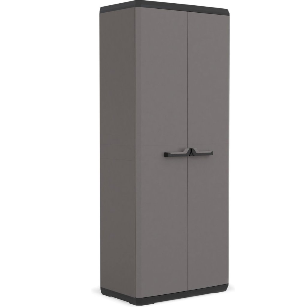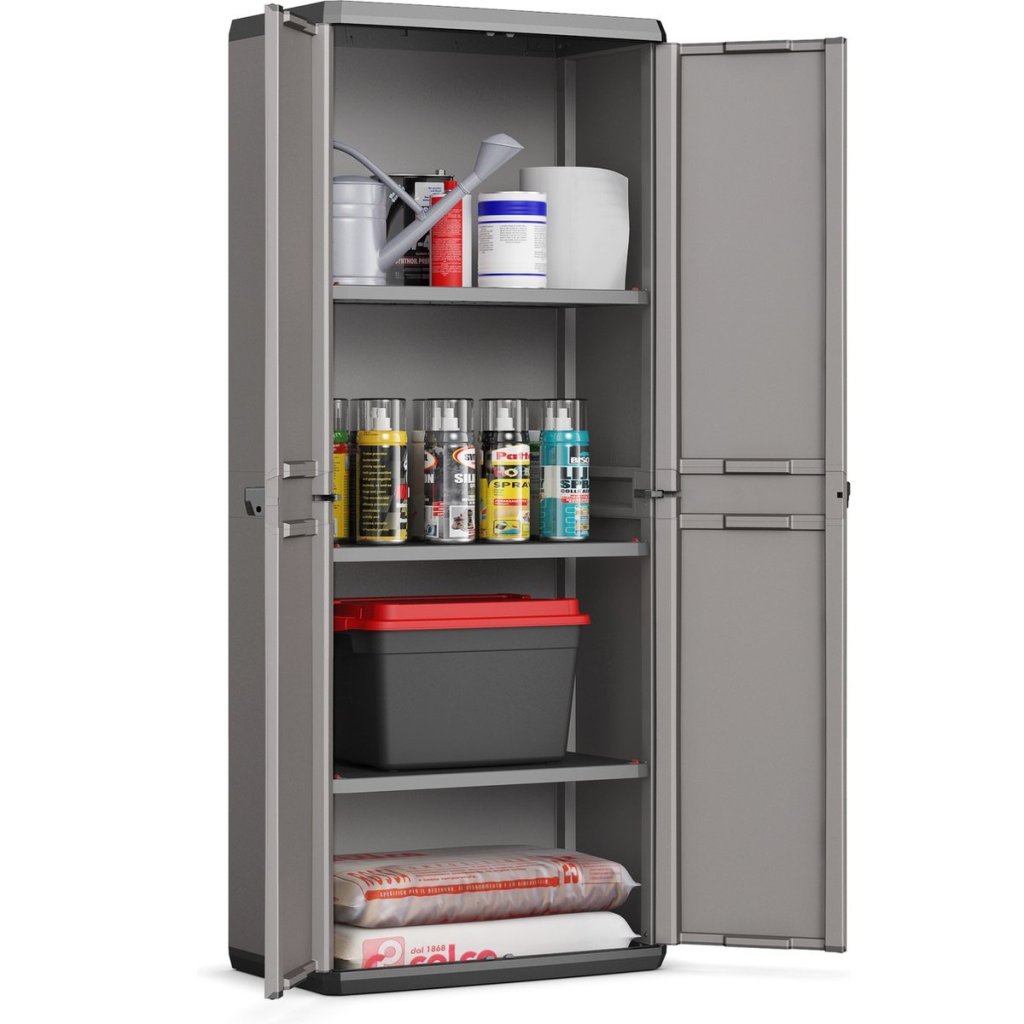 Ez a szekrény magas minőségű műanyagból készült, amely ellenáll az időjárás viszontagságainak és az UV-sugaraknak, így kültéren elhelyezve is megőrzi megjelenését és funkcionalitását. Az Ergonomikus fogantyúk kényelmes nyitást biztosítanak, a zárrendszer pedig extra biztonságot nyújt értékei számára (a zár nem tartozék).