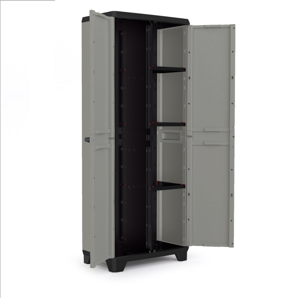 Egy másik lehetőség ennél a terméknél a belső tér lakattal történő rögzítése. A szekrény belseje ketté van osztva - az egyik oldalon egy nagy, nyitott helyet találunk, amely lehetővé teszi, hogy könnyedén elhelyezhessük a seprűket, felmosórongyokat vagy más hosszú tárgyakat, amelyeket általában nehéz valahol megtalálni. A másik oldalon 3 polc található, amelyek maximális terhelhetősége 10 kg.