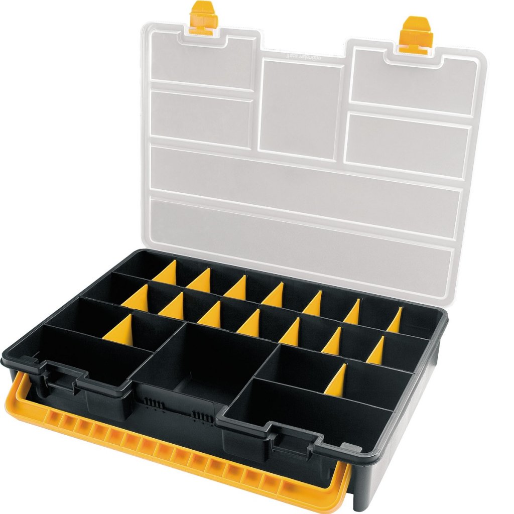 Műanyag szervező L443 x P317 x H80 mm, kivehető elválasztókkal, átlátszó borítással