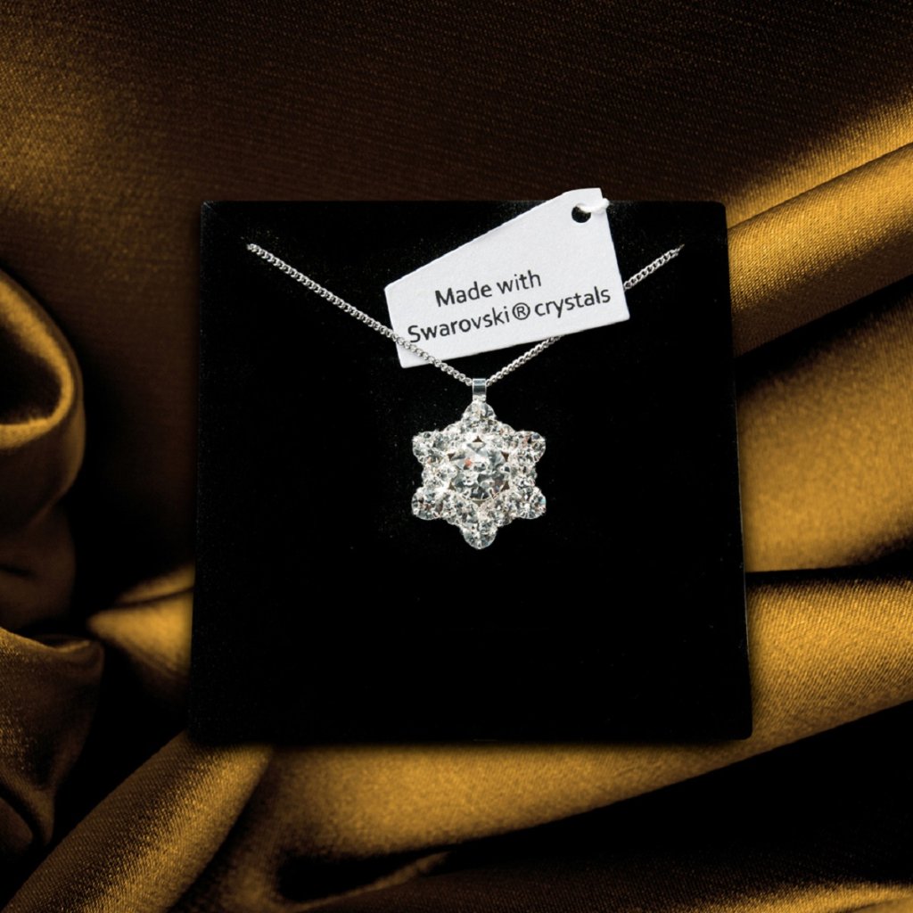 Nyaklánc - medál mérete 25 x 20 mm, 13 Swarovski kristállyal kirakva, ezüstözött ékszercsúszda, 45 cm hosszú lánc.