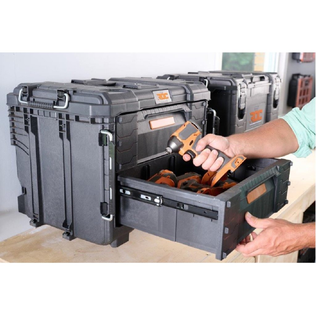 A doboz 2 tágas fiókkal rendelkezik, amelyek akár 10 kg teherbírásúak, így bőséges helyet biztosítanak szerszámainak és egyéb műhelyeszközöknek. Teljes befogadóképességük 28 liter. Az elülső oldalon narancssárga feliratozó címkéket talál, így mindig tudni fogja, hogy melyik fiókban mit tárolt. Az egyik fiók osztóelválasztókkal is fel van szerelve a kisebb alkatrészek még jobb rendszerezése érdekében. A fiókok biztonsági ütközőkkel vannak ellátva, hogy megakadályozzák a véletlen kicsúszást.