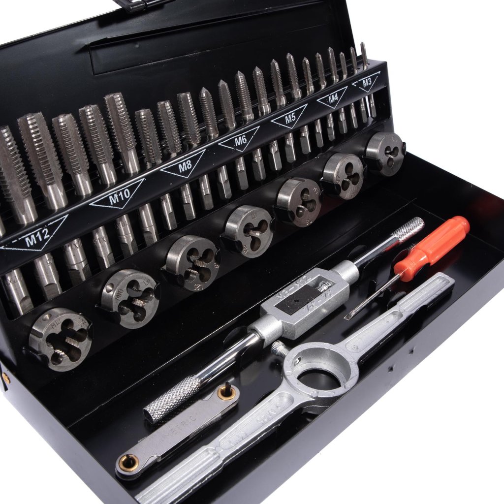 Szerszámacél készlet belső és külső menet vágásához, mérőeszköz metrikus menet méréséhez.