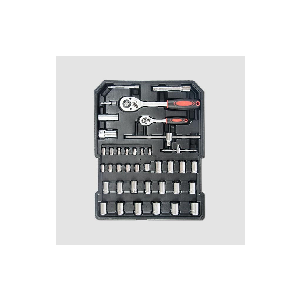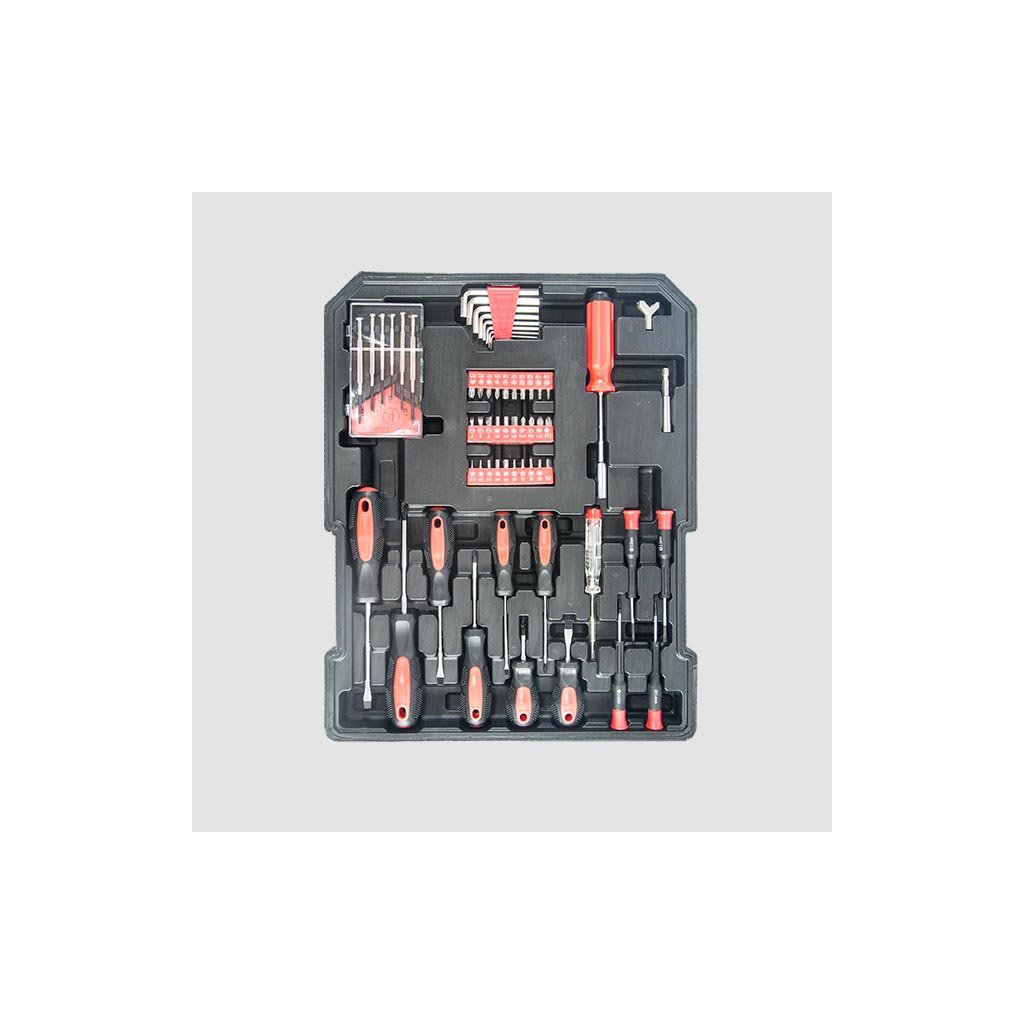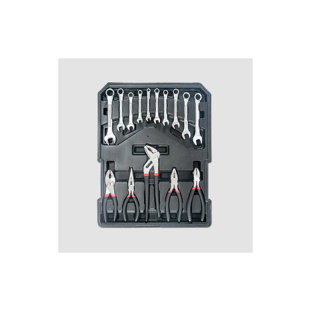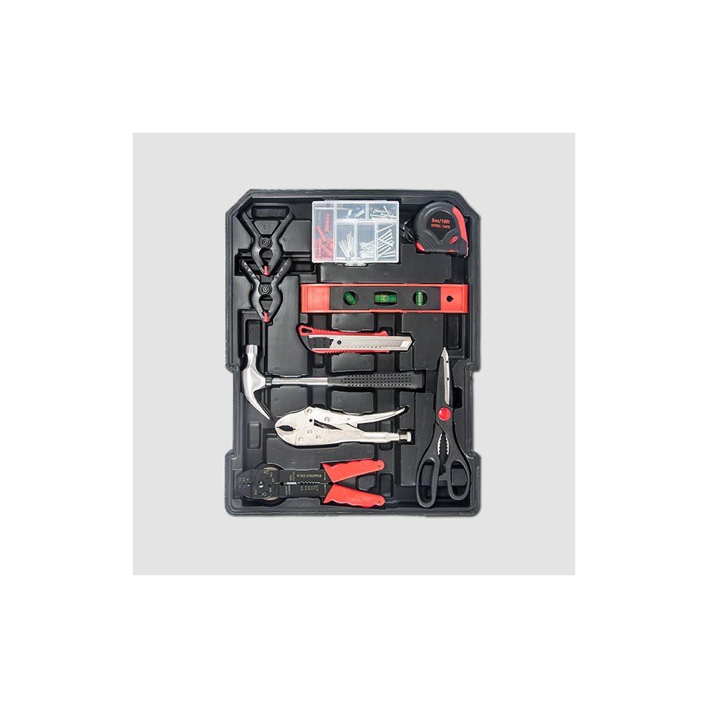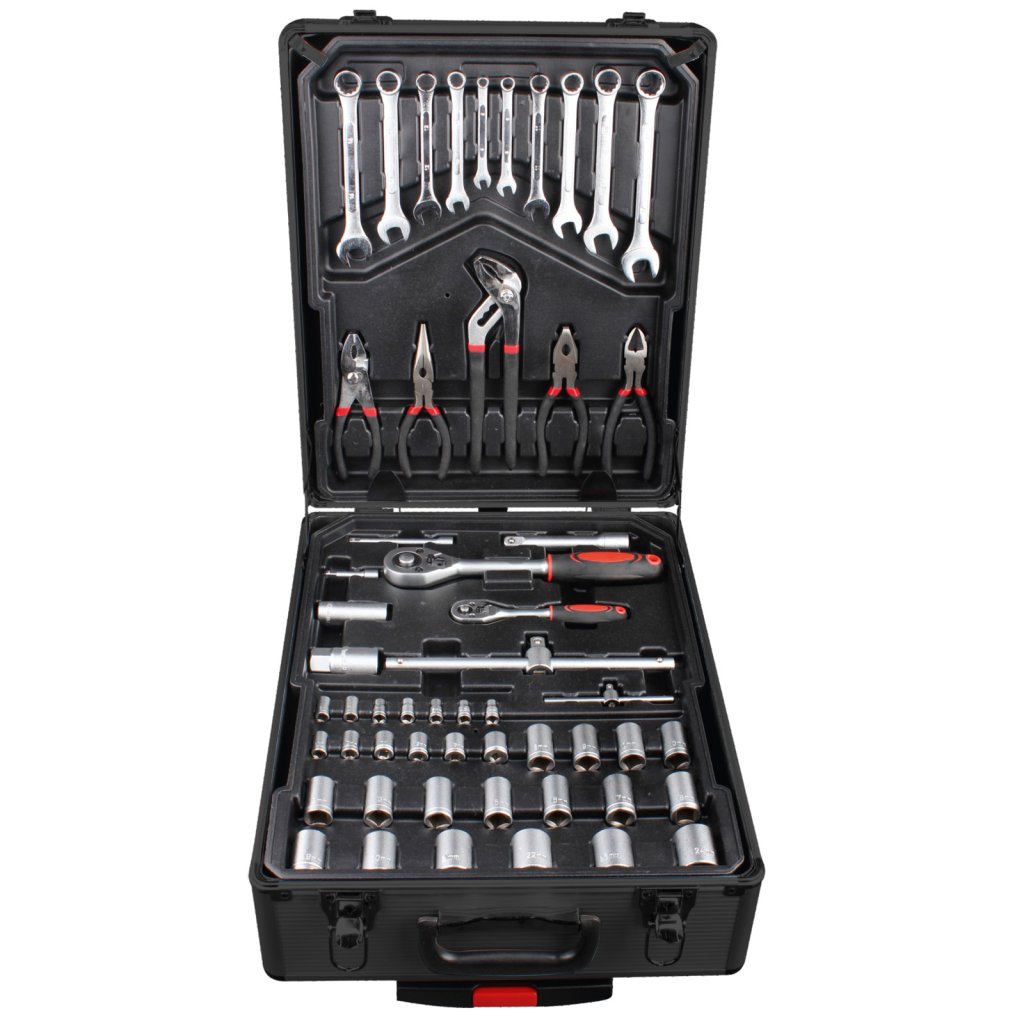 1x alumínium bőrönd kerekekkel ..H - 52cm, B - 37cm, D - 21cm 1x fém törőkés 1x ácskalapács 1x görgős mérőszalag 5m, acélszalag 1x vízmérték 60x szögek, csavarok 2x műanyag bilincs 1x csatlakozó fogó 1x villanyszerelő szalag 1x olló 1x meghosszabbított fogó, 1x önfeszítő fogó 1x oldalvágó olló, 1x sico fogó 1x kombinált fogó, 1x állítható kombinált fogó 2x gyertyakulcskulcs 1-2 16 és 21 mm, 3x hosszabbító 10x szemkulcs 6,8,10,11,12,13,14,15,16,17mm 2x orsócsavar -1-4 és 1-2 8x csavarhúzó (-) 6100, 375, 575, 638 (a) 375, 575, 6100, 638, CRV 10x óraműves csavarhúzó 2x racsni - 1-4 és 1-2 30x bit műanyag tartóban, 1x Y bit 1x mágneses bittartó, 1x csavarhúzó a bitekhez 13x 1-4 dugókulcs 4,4,5,5,5,5,5,6,7,8,9,10,11,12,13,14mm 17x 1-2 dugaszolóaljzat 8,9,10,11,12,13,14,15,16,17,18,19,20,21,22,23,24mm 1x feszültségmérő 100V-250V GS, 9x imbuszkulcs