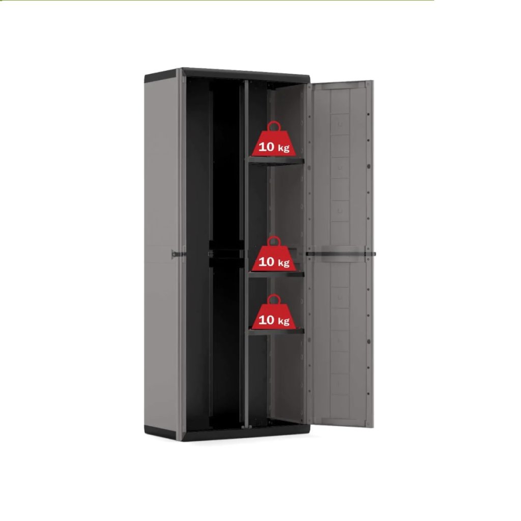 Szürke kivitelben, fekete részletekkel, mindenki szeretni fogja. Erős és tartós műanyagból készült. A Jolly használati szekrény méretei 68 x 166 x 39 cm. Alkalmas belső használatra.