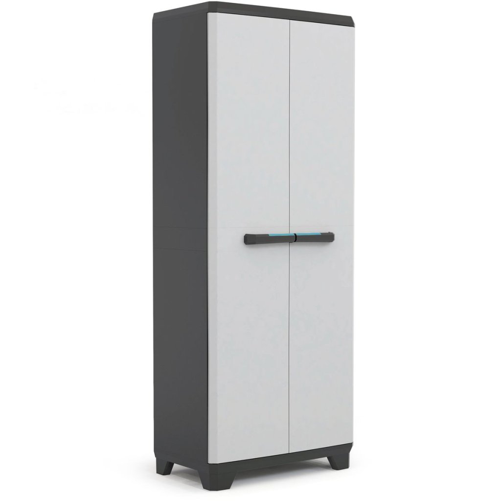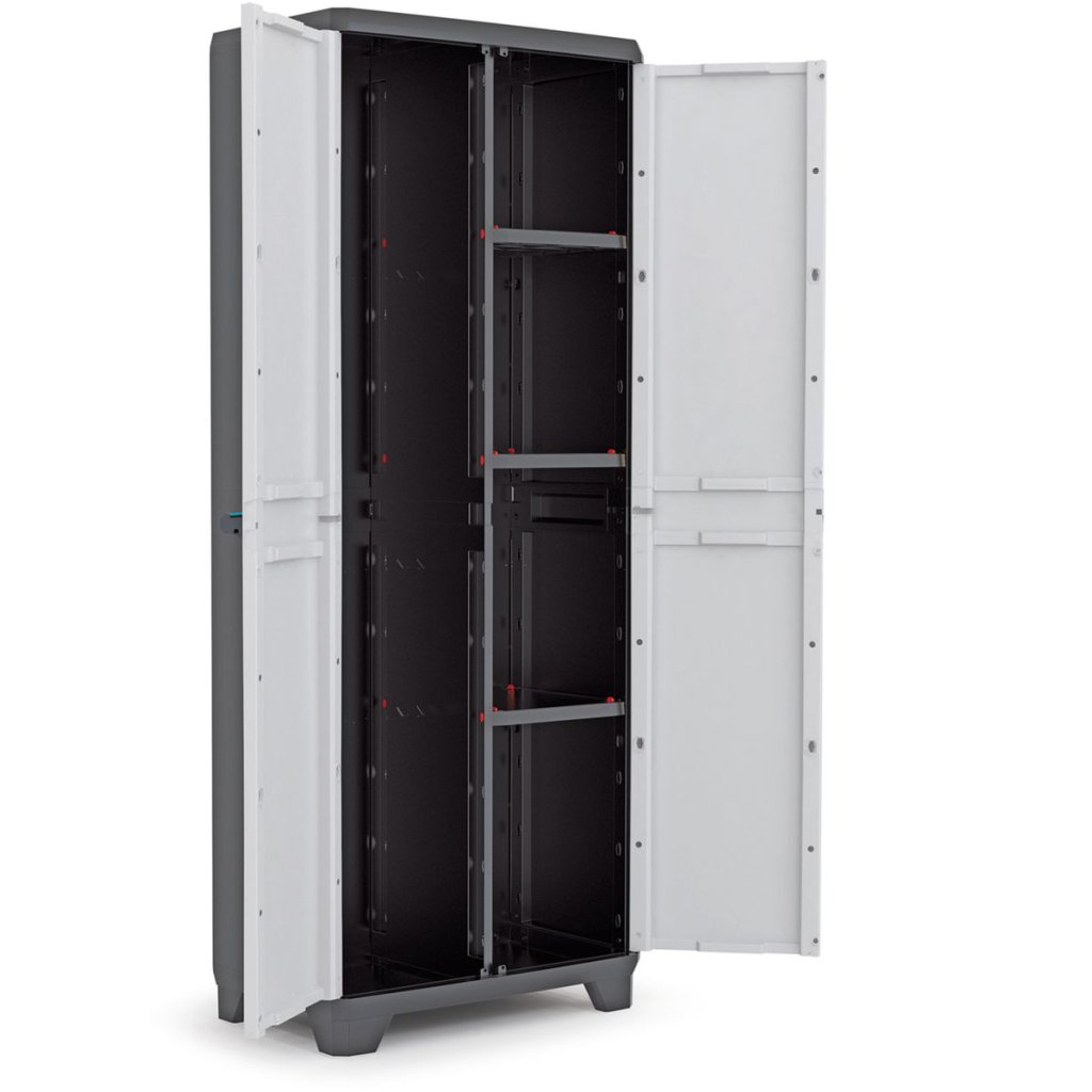 Szekrényt keres a fürdőszobájába, amely hosszú ideig tart és sok mindent el tud helyezni? Akkor a KIS Linear Utility műanyag szekrény fekete és szürke színben az Ön számára készült. Ez a szekrény 68 x 173 x 39 centiméteres, és két tárolórekesszel rendelkezik. Jobb oldalán 3 variálható polccal van felszerelve, amelyek teherbírása 10 kilogramm, bal oldalán pedig egy hely van a magas tárgyak, például seprűk, felmosórongyok és hasonlók tárolására. A szekrény alkalmas a fürdőszobába, mivel szép vonalvezetésű, és ergonomikus kék színű fogantyúkkal is fel van szerelve. Használhatja azonban a műhelyben, a garázsban vagy a takarítószobában is. Összeszerelése nagyon egyszerű, és bárki elvégezheti mindössze 15 perc alatt.