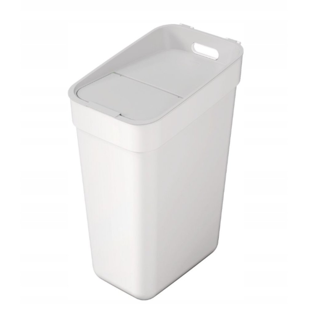 Műanyag READY szelektív hulladékgyűjtő fehér színben, praktikus használatra, középen nyíló egyenes fedéllel, opcionális falikonzol a kuka felakasztásához mellékelve. Kombinálható az azonos termékcsaládból származó kisebb szemetesekkel. Térfogat 30L, 24,5 x 55 x 36,5 cm.