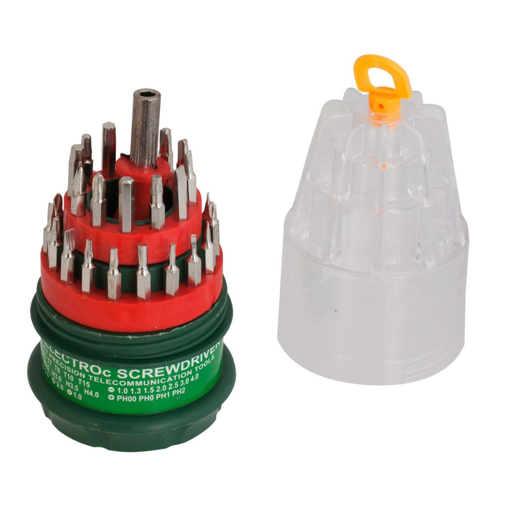 31 darabos mini bit készlet a finommechanikához, praktikus piramis állványban, fogantyúval