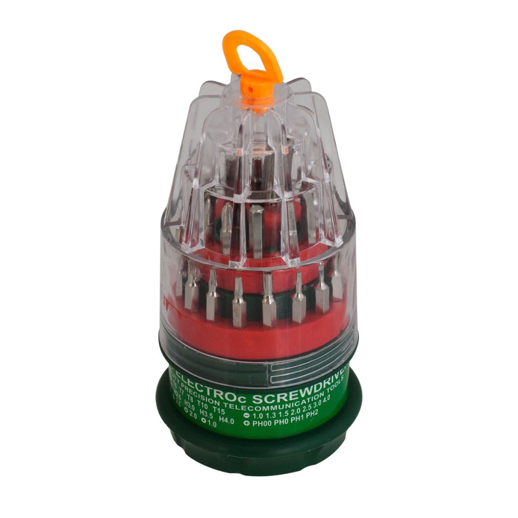31 darabos mini bit készlet a finommechanikához, praktikus piramis állványban, fogantyúval