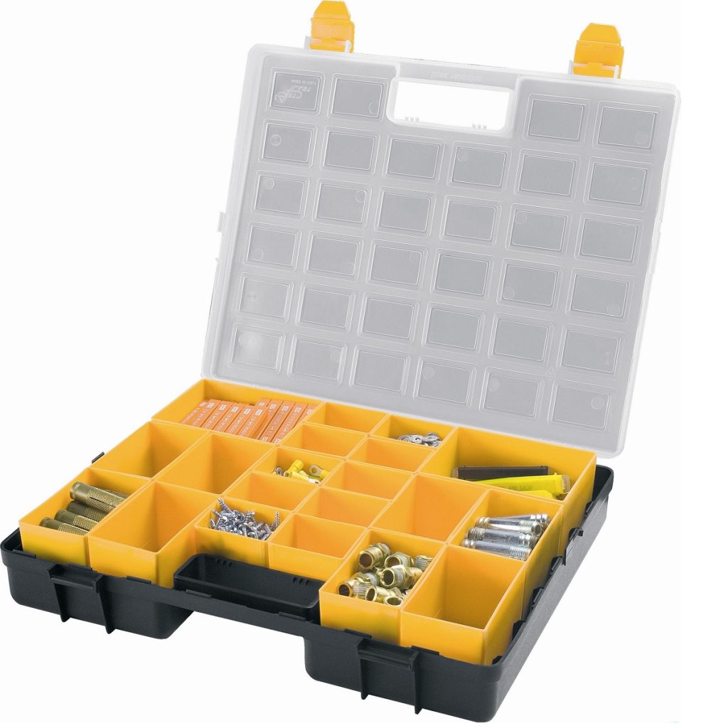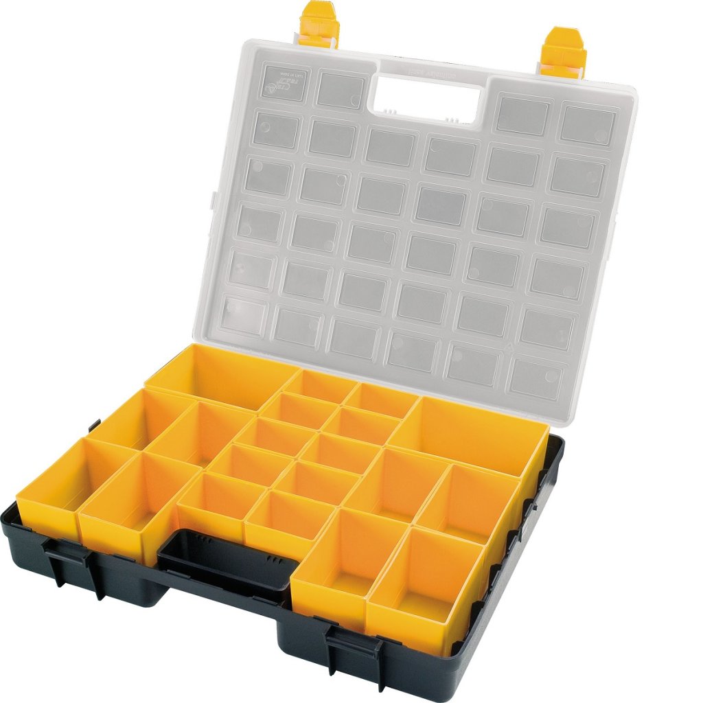 Organizátor átlátszó fedéllel és 20 dobozzal különböző tárgyak számára, amelyeket nem csak a műhelyben, hanem otthon is használhatunk.
