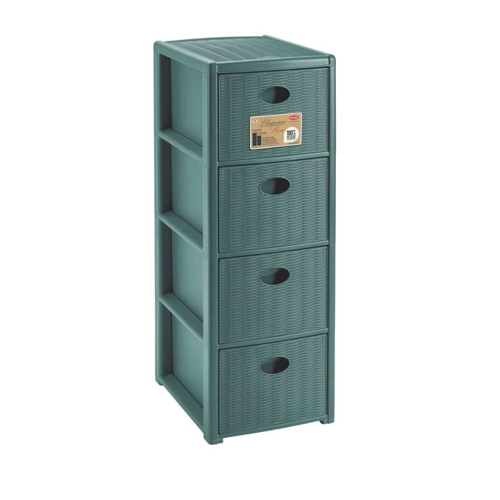 Újrahasznosított műanyag tárolószekrény, 4 fiókkal, 30×40×80 cm-es méret, karcsú forma, modern design, könnyű karbantartás.