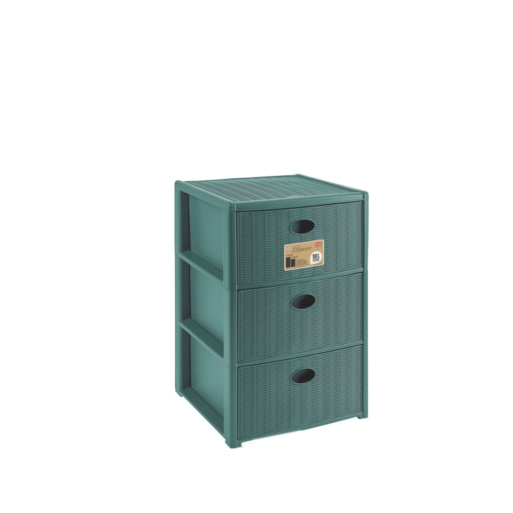 Praktikus és környezetbarát tárolószekrény újrahasznosított műanyagból, ideális otthoni rendszerezésre a fürdőszobában, hálószobában vagy irodában. Három tágas fiókot kínál. A felület textúrája szövetet imitál, és modern, elegáns megjelenést kölcsönöz a szekrénynek. A fiókok könnyen kicsúsztathatók, a szerkezet könnyű és stabil, az anyag tartós és könnyen mosható. Emellett a szekrény fenntartható választás a mindennapi használatra.