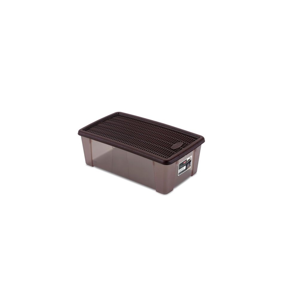 Multifunkciós műanyag doboz, 32,5 × 19 × 11 cm-es méretekkel, elegáns textúrával, zárható fedéllel, ideális tárolásra és szervezésre.