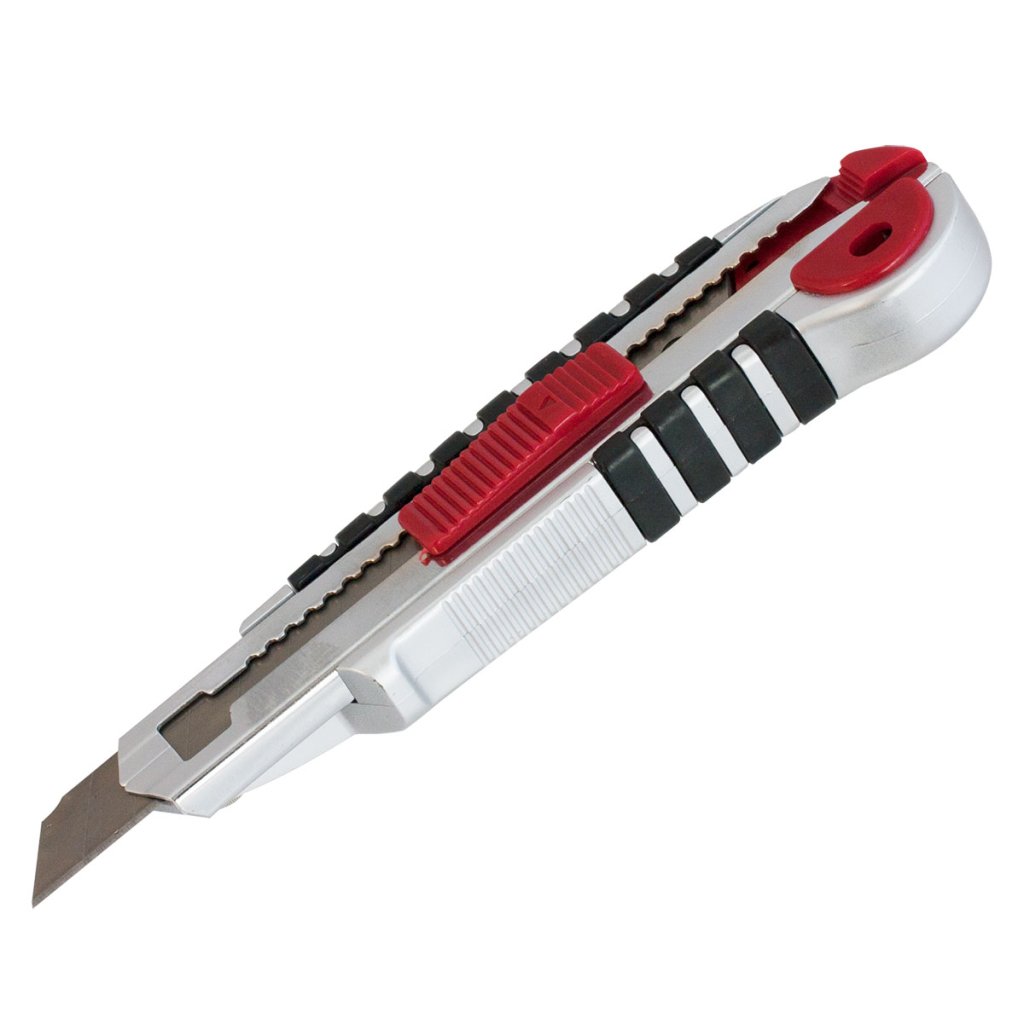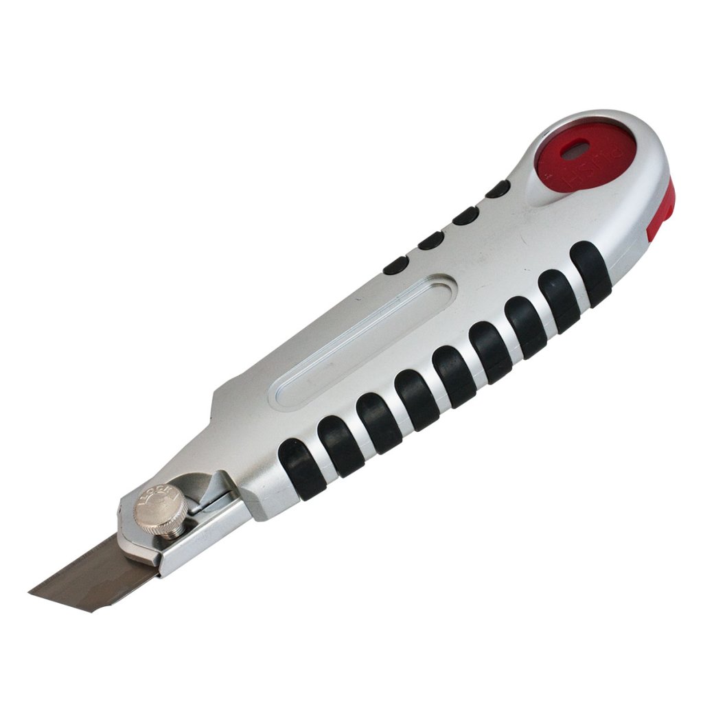 Ez a kés megerősített fém vezetősínekkel és ergonomikus formával rendelkezik, amelyet csúszásmentes TPR anyag egészít ki. A tartalék pengék a késtálcában tárolhatók. A kés 5 darab letörhető pengét tartalmaz a készletben. A kés olyan mechanizmussal van felszerelve, amely automatikusan új pengéket tölt fel a tálcából. A régi penge előrecsúsztatása és eltávolítása után csak a csúszógombot kell hátracsúsztatni, és az új penge újratöltődik a tárból a további használathoz. A kinyújtott penge egy segédcsavarral rögzíthető a véletlen elcsúszás megakadályozására. A tárba 18 mm széles, szabványos törőpengék tölthetők újra. A tálca a fémvezető végén lévő piros fülnél hátrafelé csúszik ki. FIGYELMEZTETÉS A tárat egy piros, lyukkal ellátott félkör alakú biztonsági retesz zárja - ezt oldalra kell kihúzni a tár felszabadításához. A pengék újratöltése és a tár visszahelyezése után helyezze vissza a zárat.